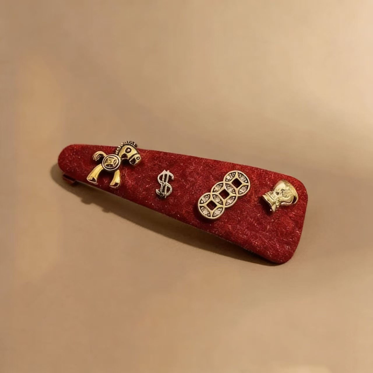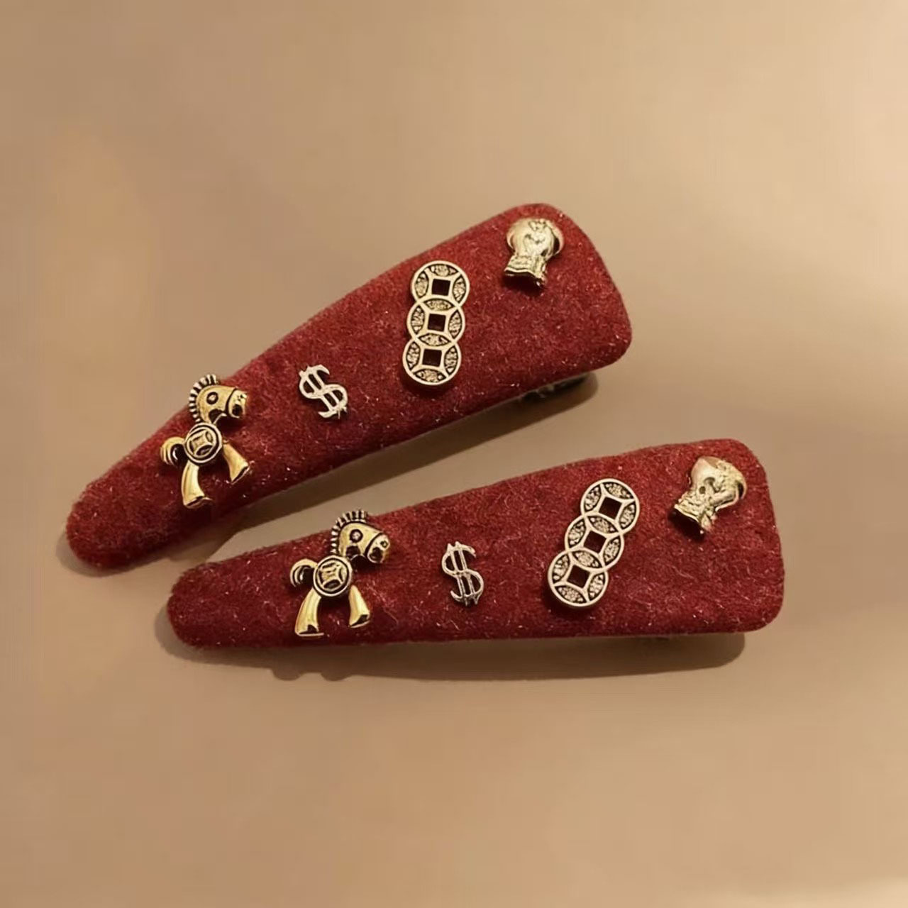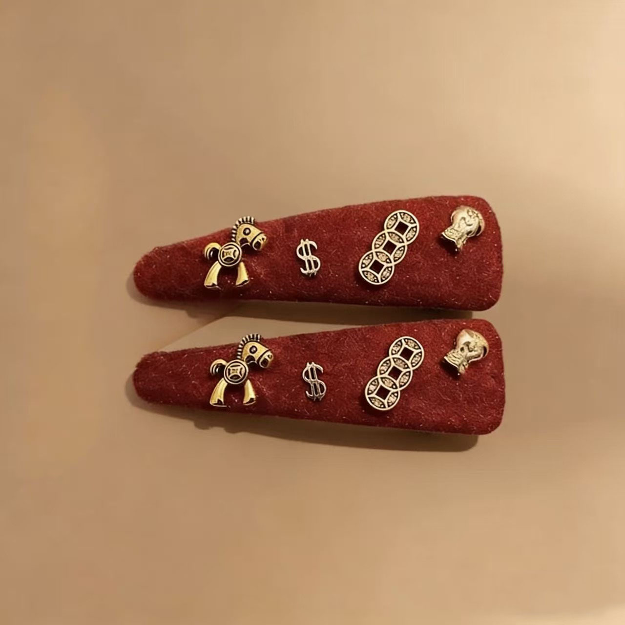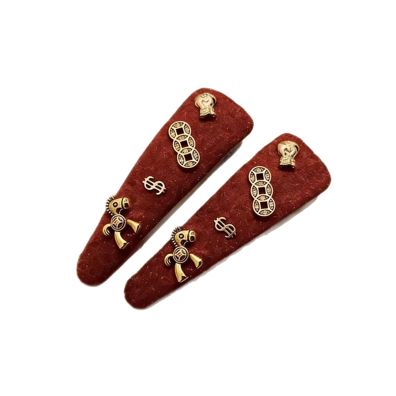 红色植绒发夹女个性设计铜钱小马侧边发卡ins时尚百搭头饰发饰潮 投诉