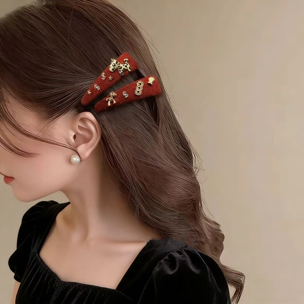 红色植绒发夹女个性设计铜钱小马侧边发卡ins时尚百搭头饰发饰潮