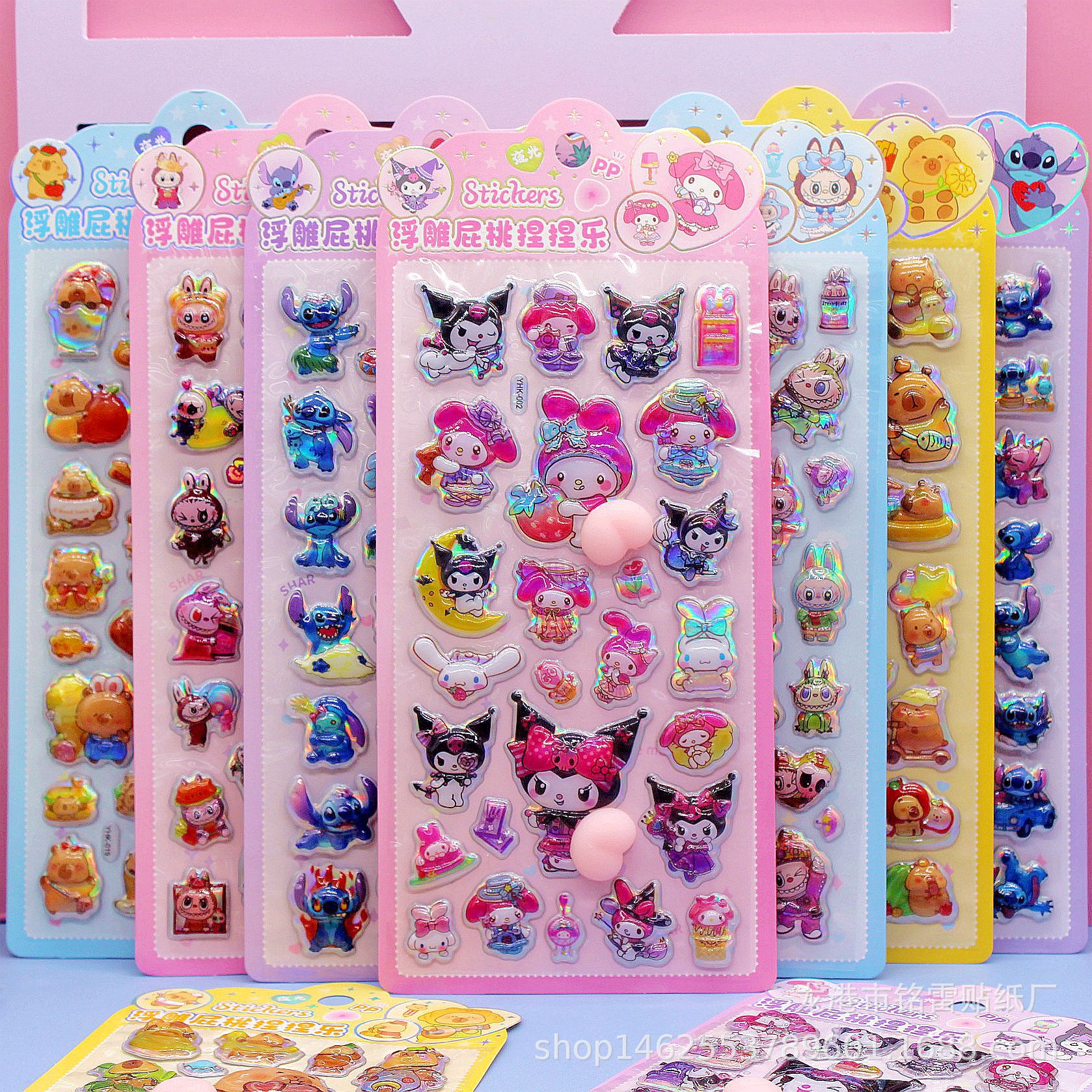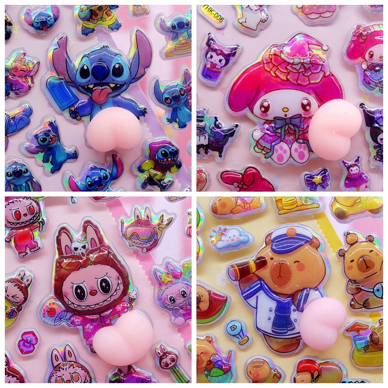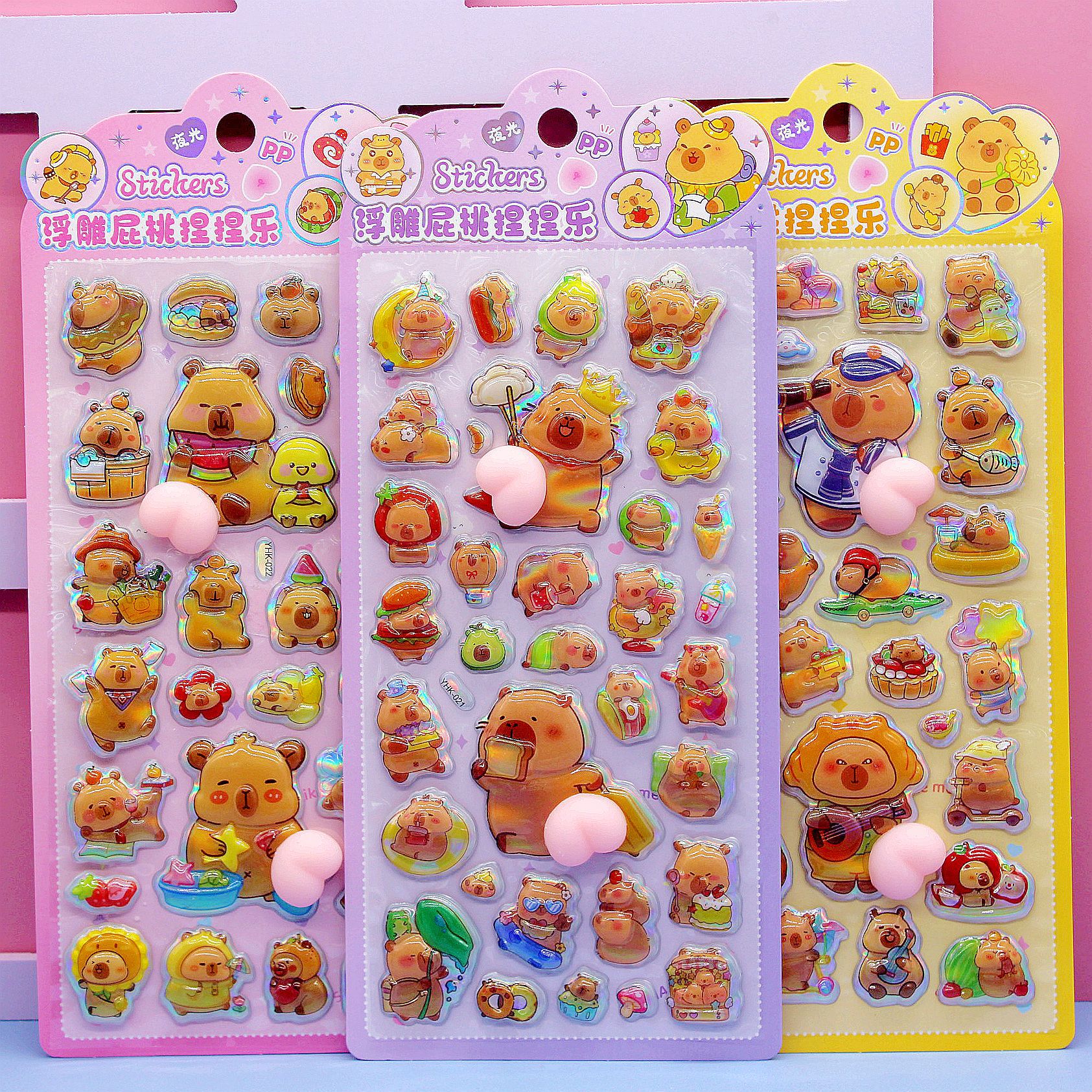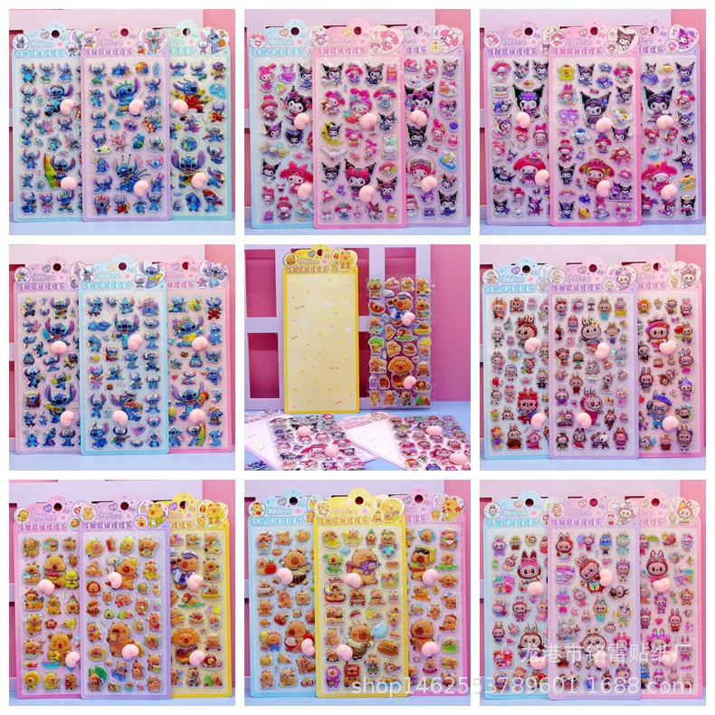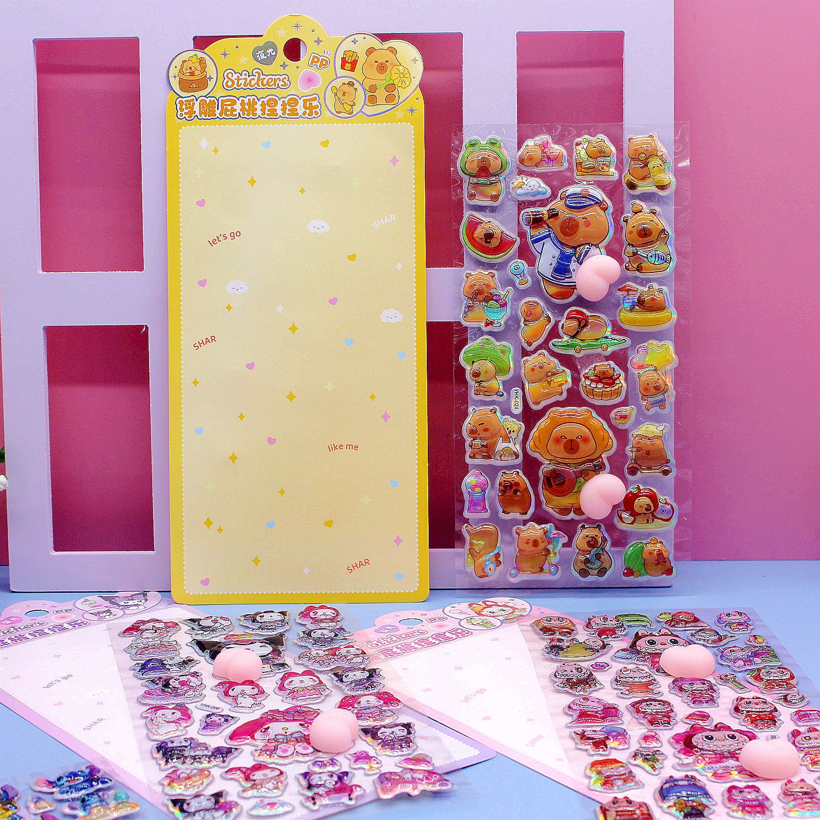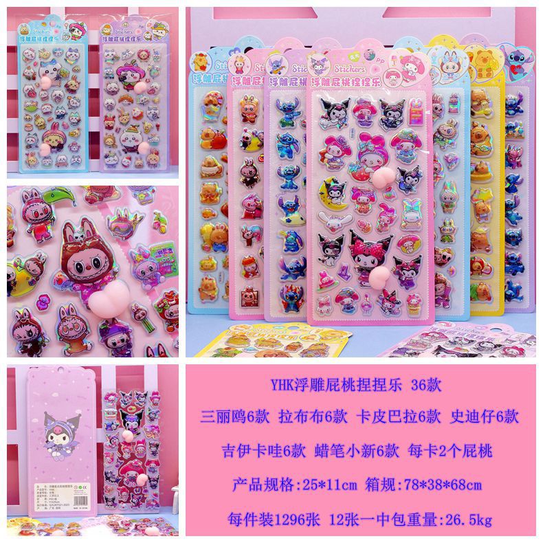清单:三丽鸥6款拉布布6款卡皮巴拉6款 史迪仔6款吉伊卡哇6款 蜡笔小新6款 每卡2个屁桃