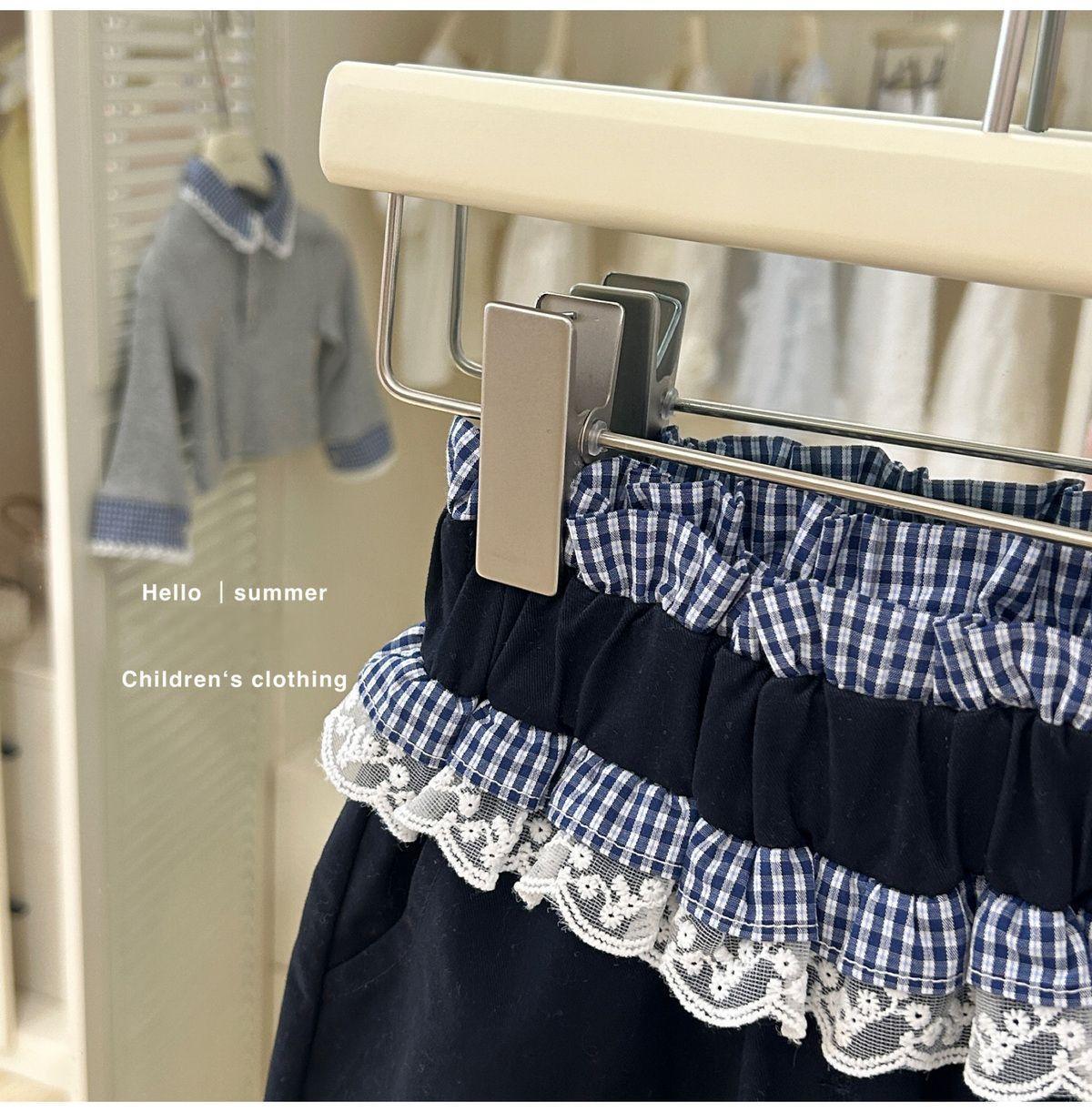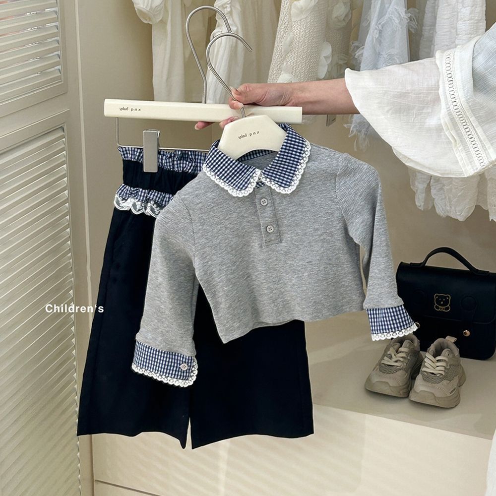 女童套装春秋款格纹假两件设计感撞色花边长袖长裤T恤春季两件套 投诉