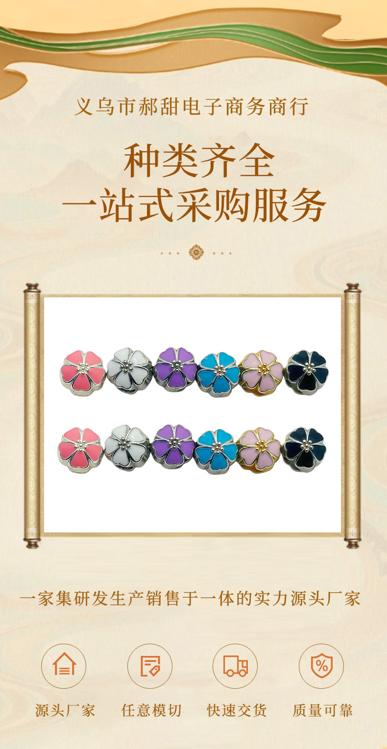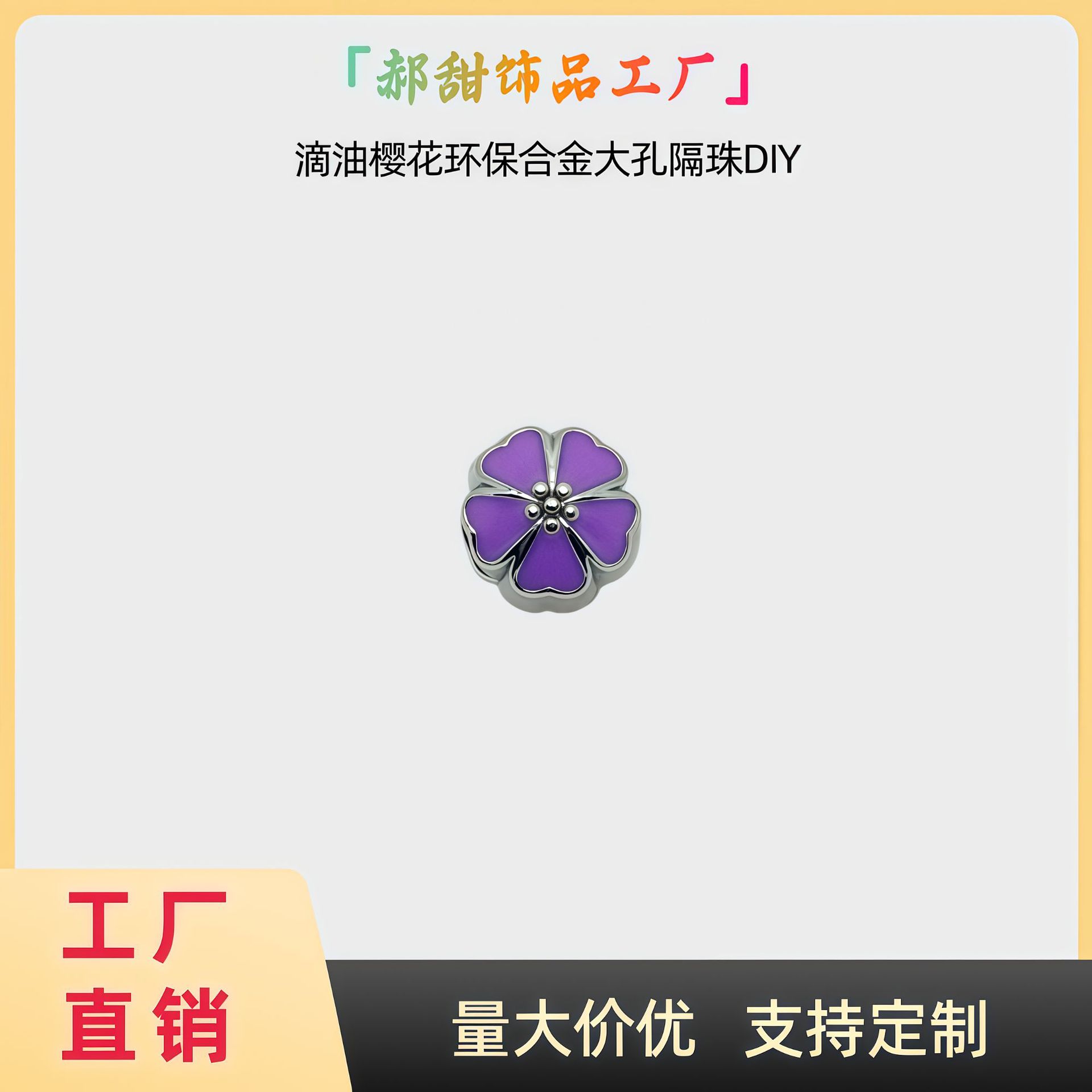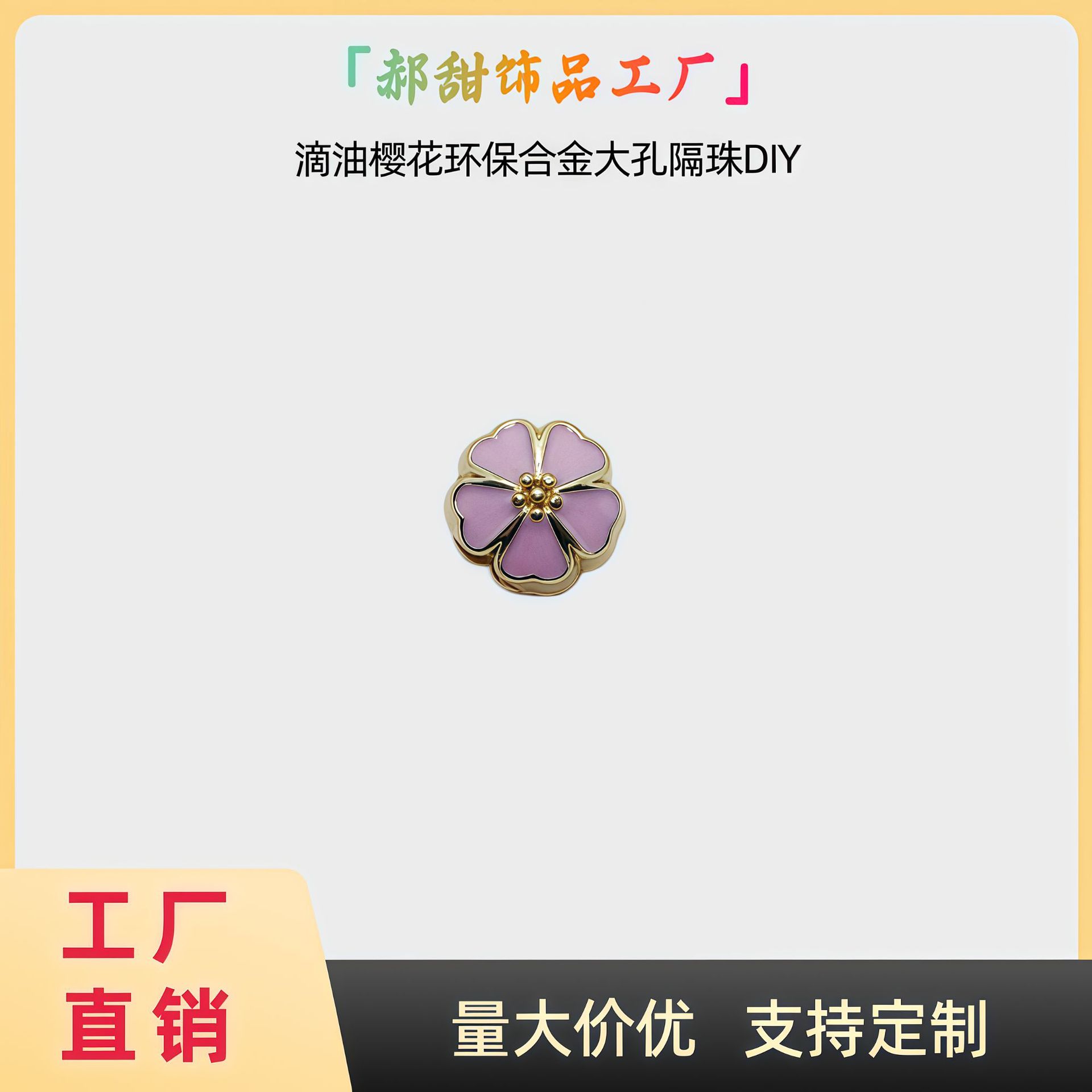 材质: 环保锌合金 处理工艺: 滴油 流行元素: 樱花 种类: 隔珠 品牌: 其他 产地: 义乌 货号: GZ125 颜色: 粉樱花隔珠,白樱花隔珠,蓝樱花隔珠,紫樱 是否跨境出口专供货源: 否 主要下游平台: 淘宝,京东,亚马逊,快手,速卖通,天猫, 有可授权的自有品牌: 是 上市年份/季节: 2025夏季 流行元素分类: 植物花卉