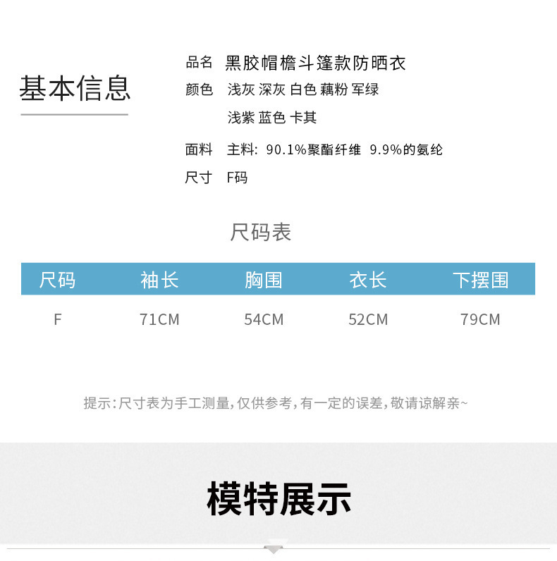 主面料成分: 涤纶(聚酯纤维) 面料名称: 冰丝 版型: 宽松型 防晒指数: UPF30+ 品牌: 柳客 袖型: 蝙蝠袖 袖长: 长袖 上市年份/季节: 2025夏季 颜色: 白色,浅灰色,军绿色,藕粉色,咖色 尺码: 均码 货号: 黑胶防晒衣 风格: 休闲风 图案: 纯色 流行元素: 拉链 风格类型: 日韩休闲 门襟: 拉链 主面料成分含量: 95%及以上 跨境风格类型: 舒适休闲 是否跨境货源: 是 厚薄: 薄 重量: 0.5 kg/件