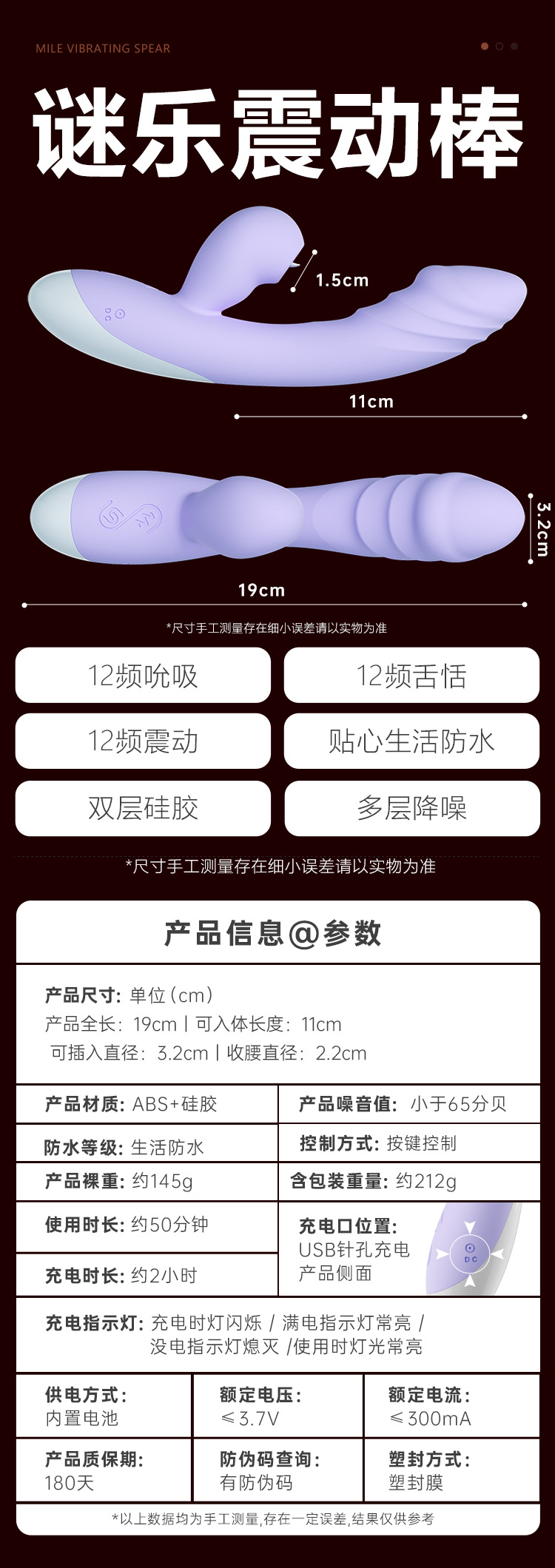 产品名称: 谜乐吮吸震动棒 材质: ABS+硅胶+PC 控制类型: 按键 年龄: 成年 保修期: 0.5年 颜色: 见详情 是否进口: 否 重量: 0.213 kg/个