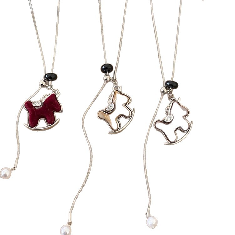 马上好运!酒红色丝绒小马吊坠项链女款复古高级感长款毛衣链配饰