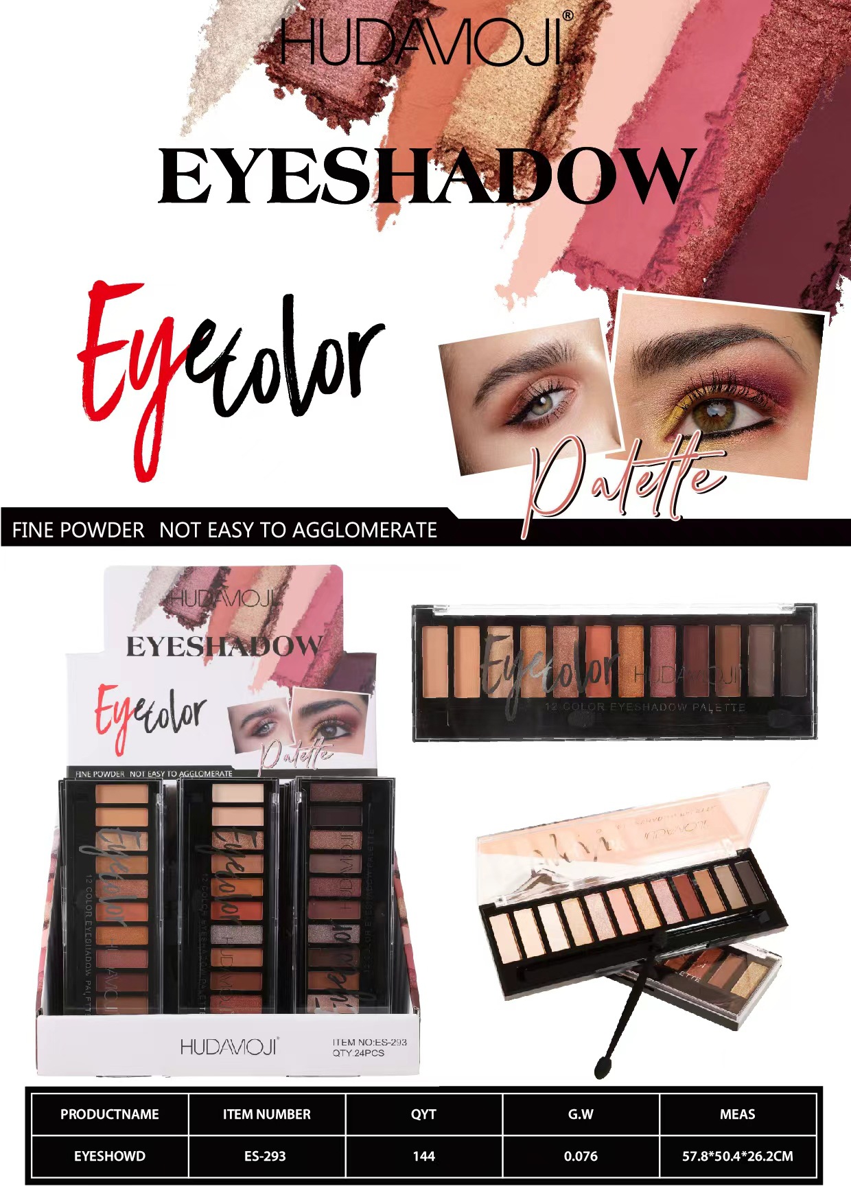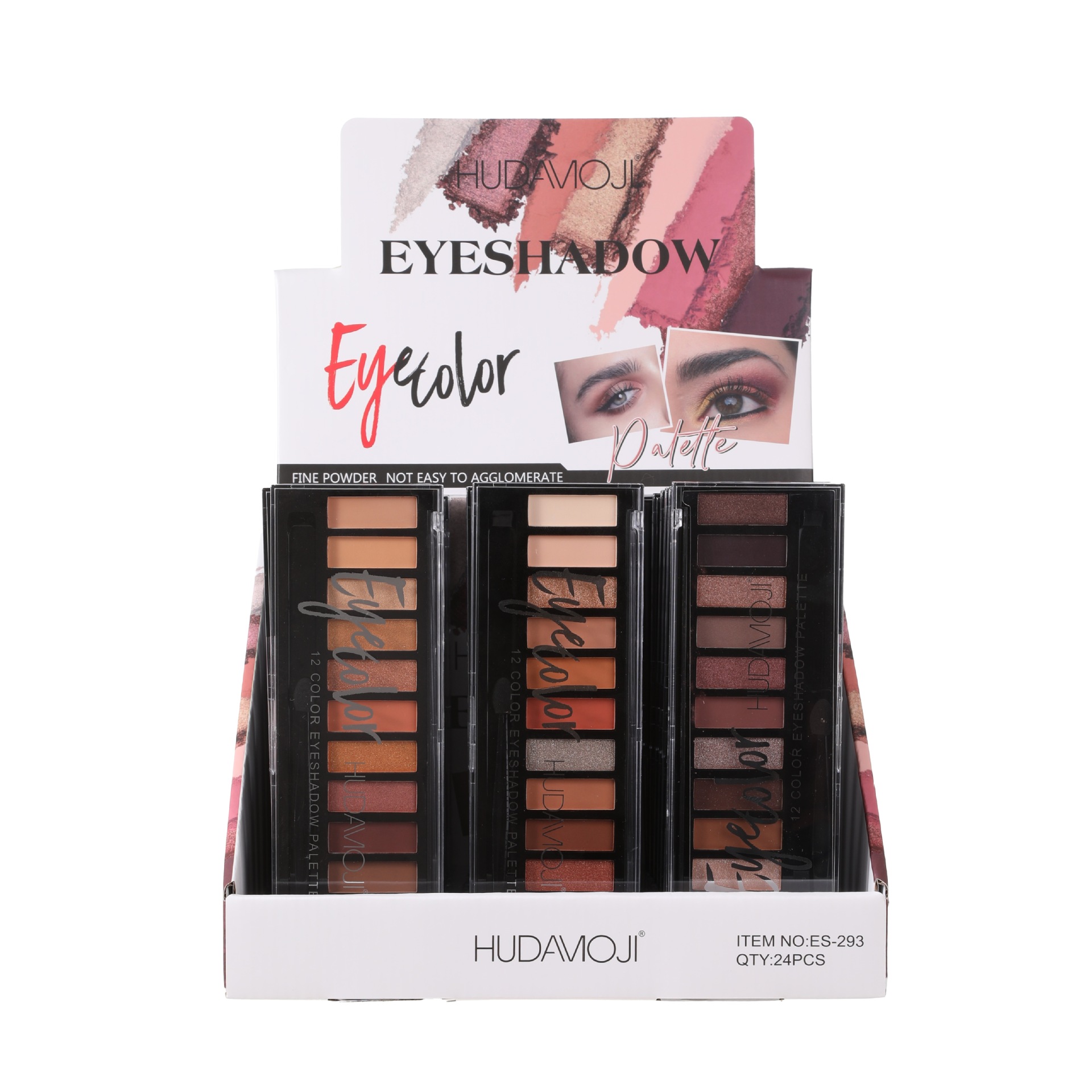 美妆工具分类: 其它化妆/美容工具 品牌: HUDAMOJI 净含量: 10 尺寸: 1 是否进口: 否 货号: ES-293 产地: 金华 颜色分类: 12色眼影(24PCS/展示盒)仅供外贸 主要下游平台: ebay,亚马逊,wish,速卖通,独立 有可授权的自有品牌: 是 是否跨境出口专供货源: 是 主要销售地区: 非洲,欧洲,南美,东南亚,北美,东北亚, 适用人群: 普通人群