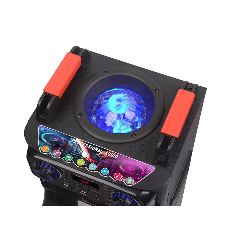 Product Configuration: double 10-inch high-power wood plastic audio, top headlight ball, front colorful light, 15V3A charger, front and rear universal wheels, dual display microphone, large remote control.