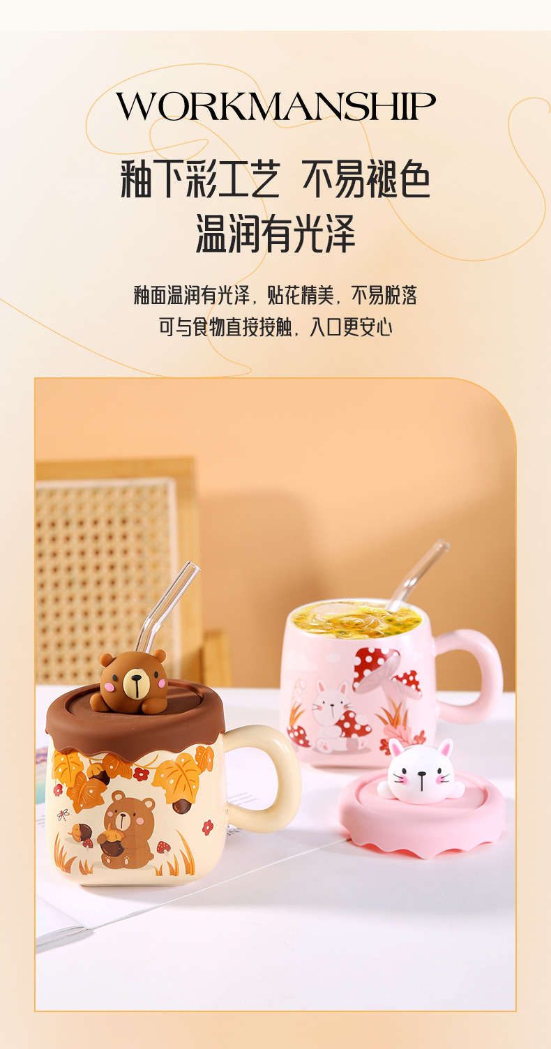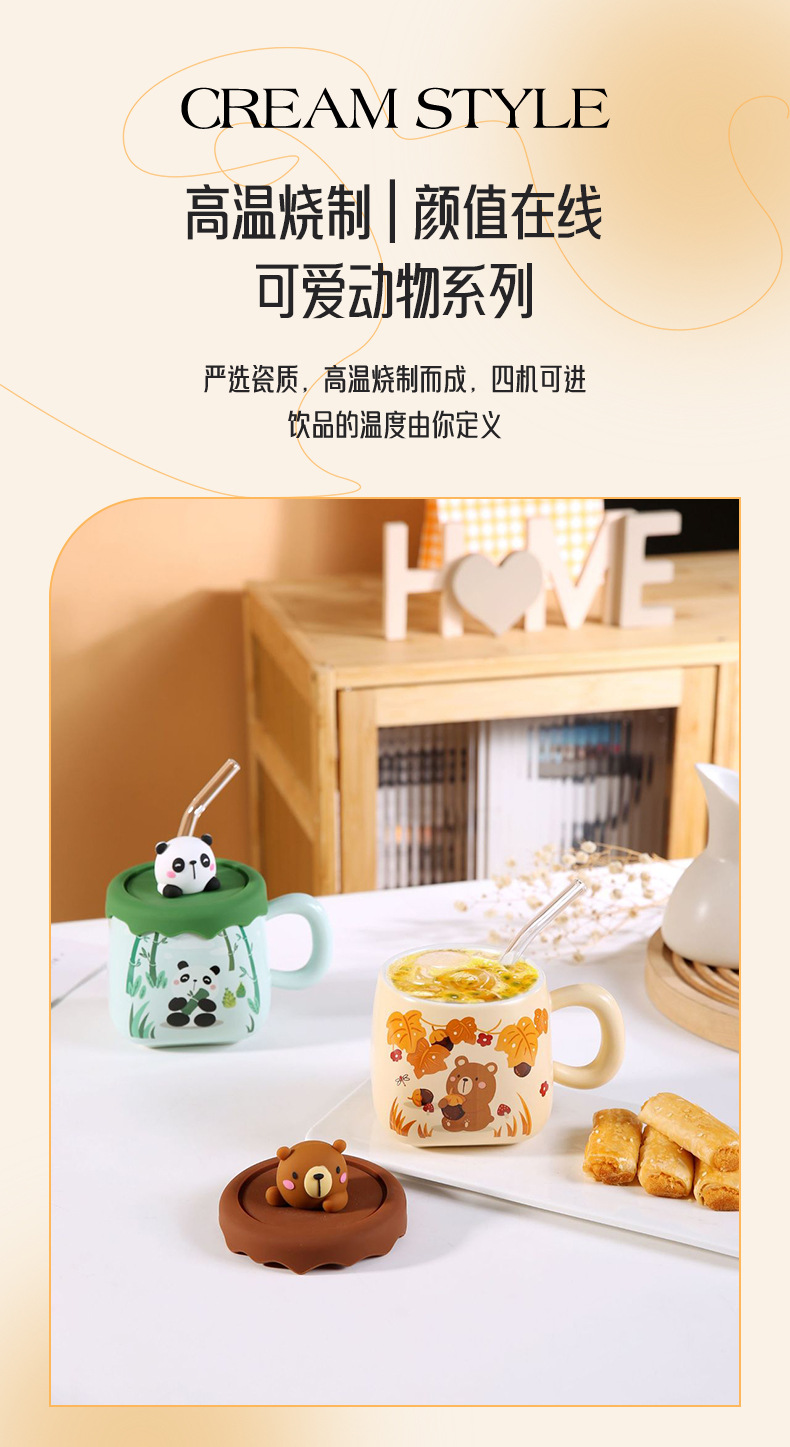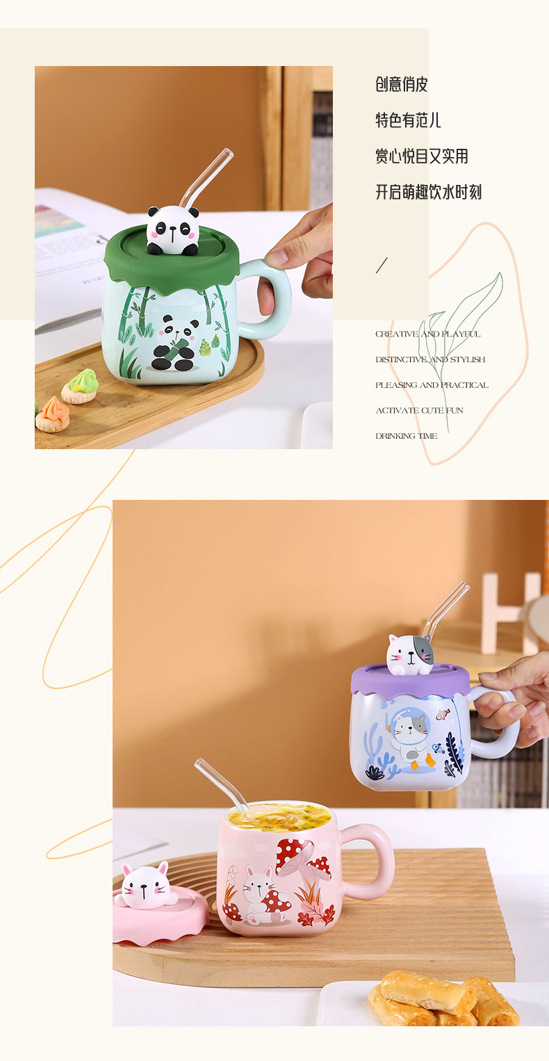 可爱卡通吸管大肚杯女高颜值陶瓷马克杯带盖情侣家用水杯大容量