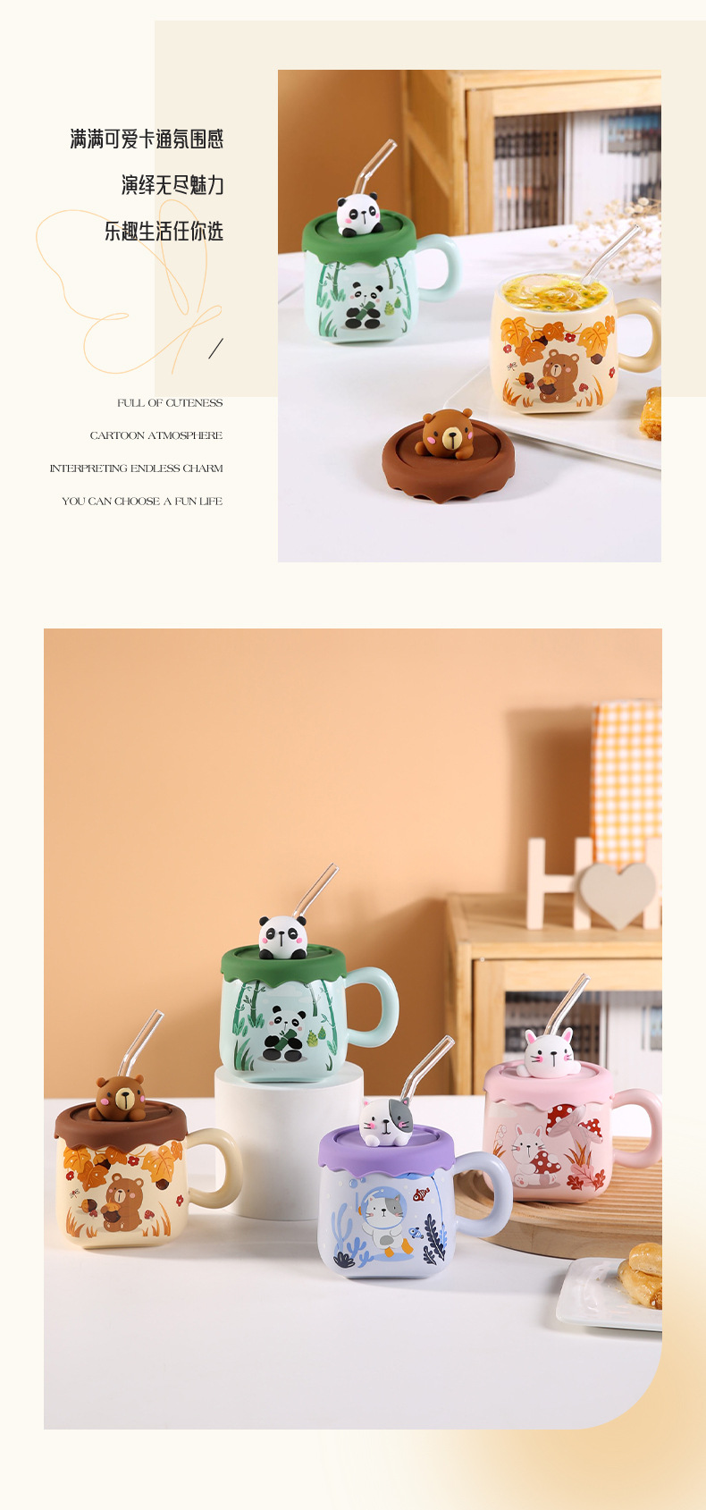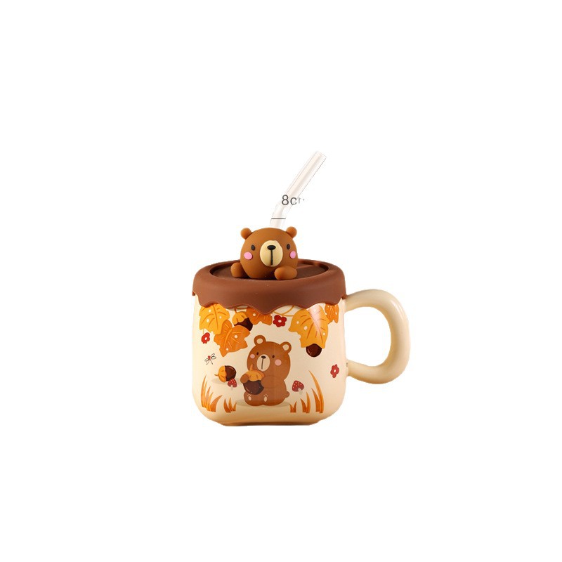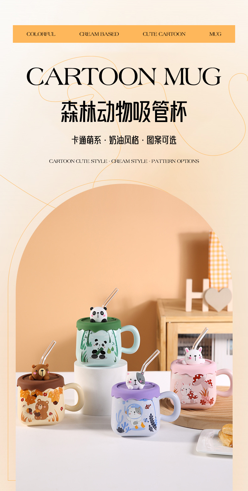 可爱卡通吸管大肚杯女高颜值陶瓷马克杯带盖情侣家用水杯大容量