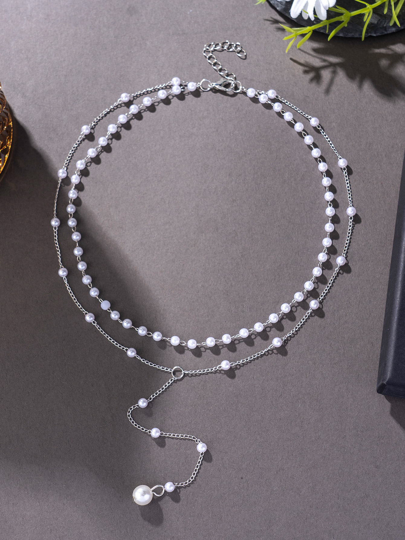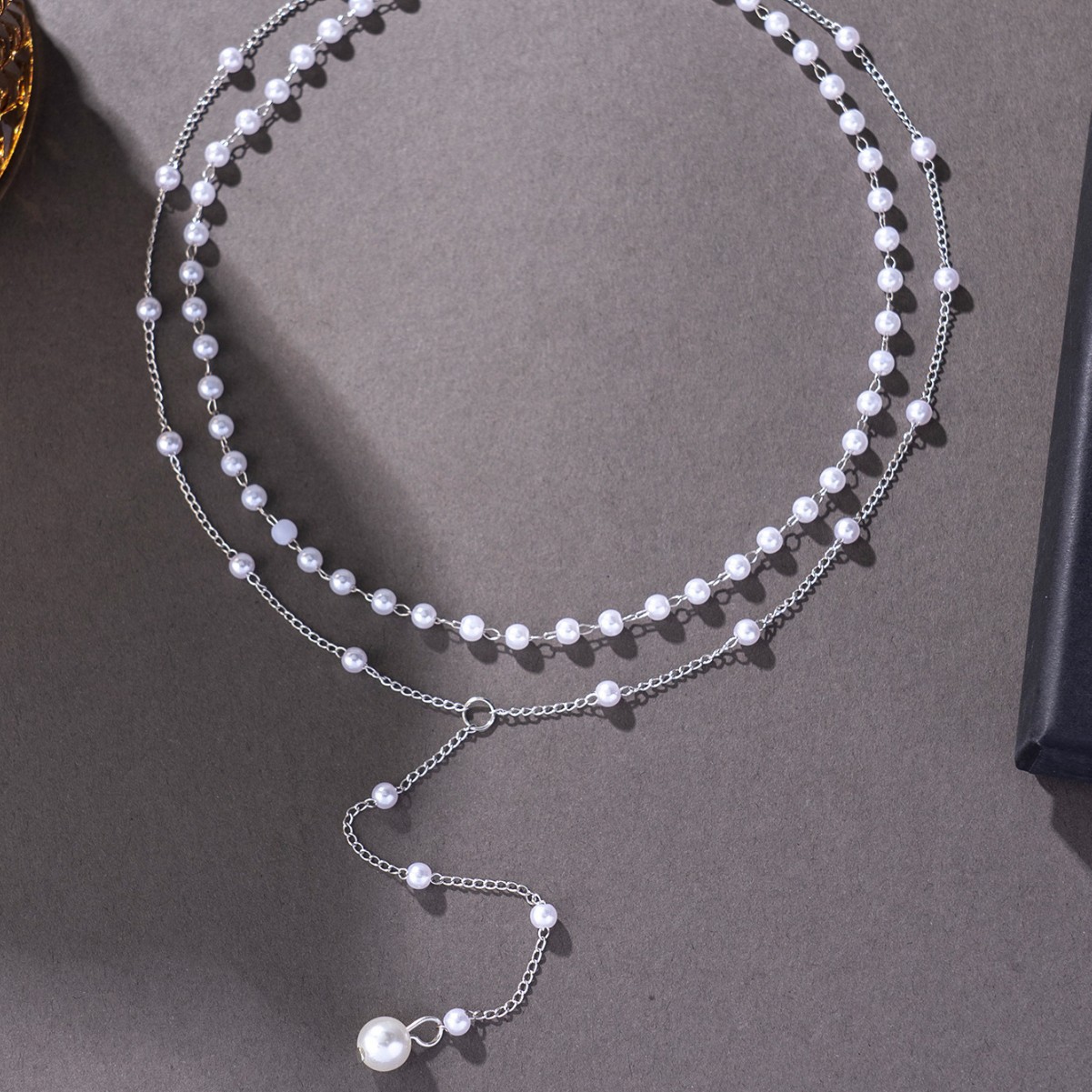 时尚跨境新款欧美风Y型仿珍珠流苏双层项链叠戴轻奢小众项链配饰