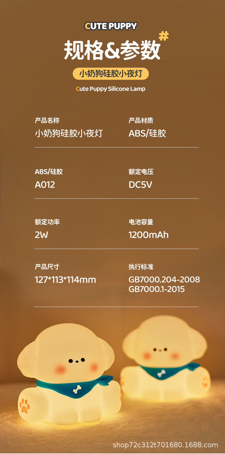附加功能: 拍拍灯,夜灯,氛围灯 供电方式: 内置电池 开关类型: 按钮式 灯罩材质: 硅胶 外形尺寸: 127x110x117mm 货号: BH18955 电压: 5V 风格: 卡通 平均使用寿命: 1年 适用送礼场合: 生日,小礼品,节日,展销会,员工福利,周 灯光颜色: 小奶狗小夜灯 光源功率: 2W 加印LOGO: 可以 主要下游平台: ebay,亚马逊,wish,速卖通,独立 重量: 0.5 kg/个