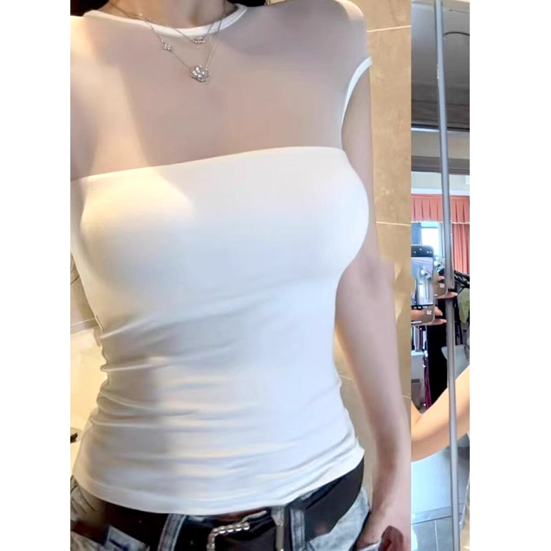 微透网纱拼接短袖t恤女夏季2025新款紧身带胸垫性感辣妹茶艺上衣
