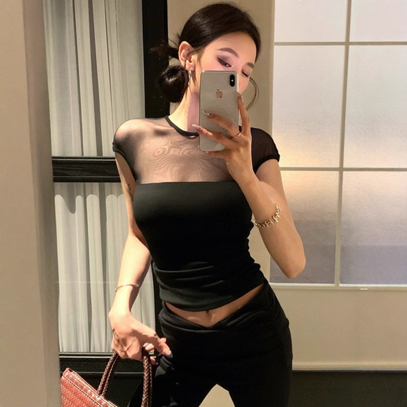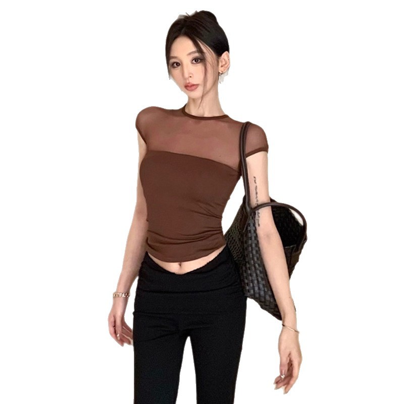 微透网纱拼接短袖t恤女夏季2025新款紧身带胸垫性感辣妹茶艺上衣 English | 投诉