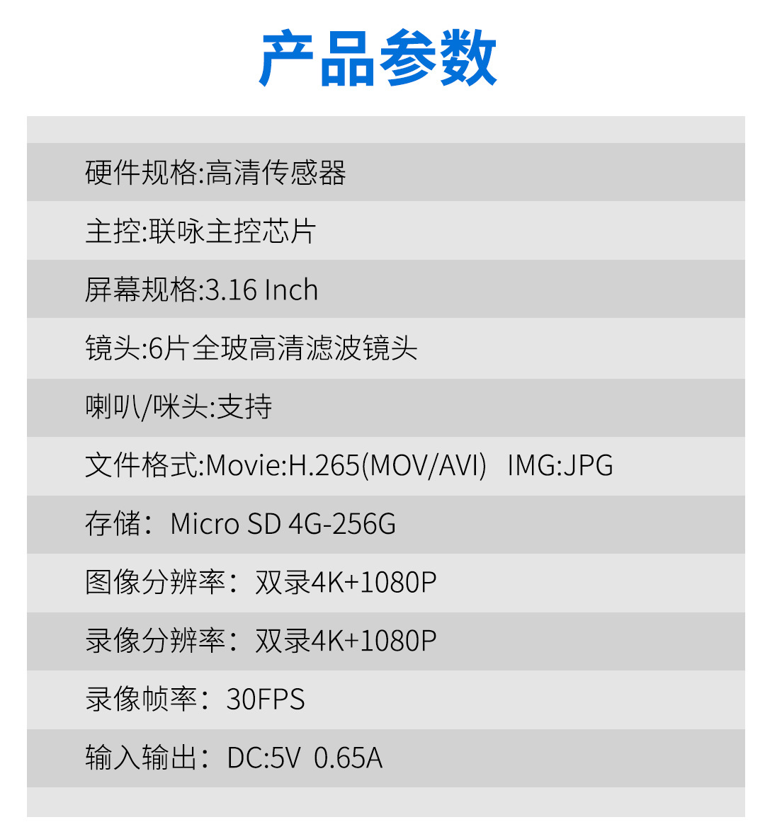 拍摄角度: 170° 储存卡: TF卡 品牌: 华畅 型号: F9 外观尺寸: 99*38*61 像素: 800万 数据存储容量: 最大支持64G 数据存储时间: 自动循环 数据传输接口: USB/HDMI 传输数率: 124