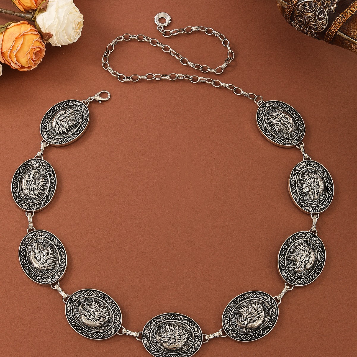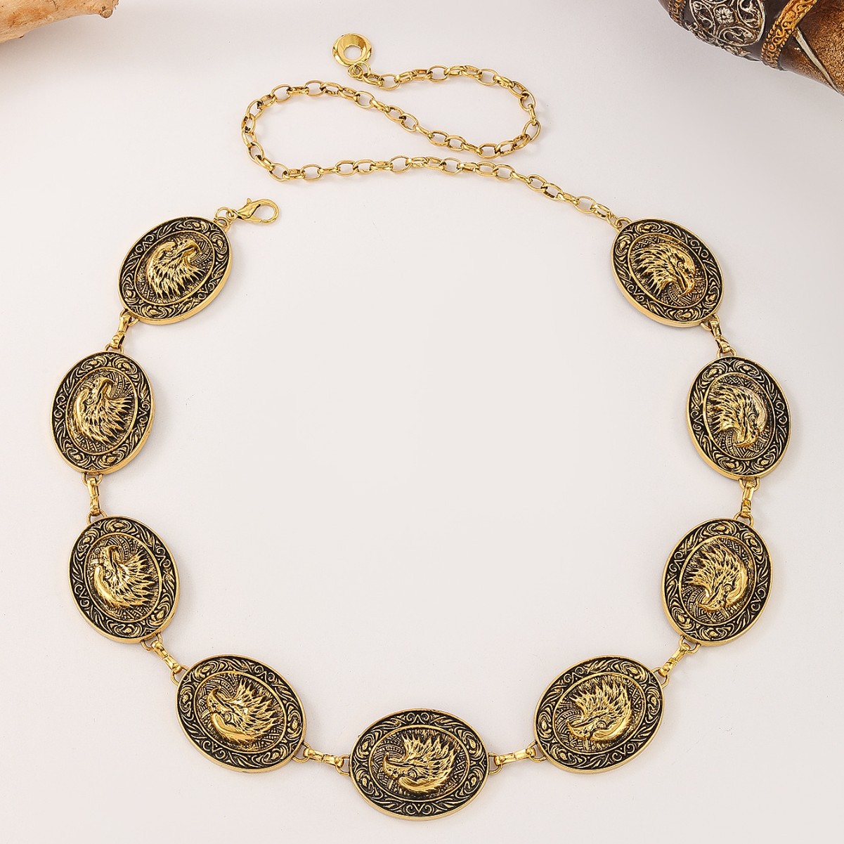 波西米亚复古金属老鹰雕刻腰链小众高级感腰带配饰民族风配裙子 English | 投诉