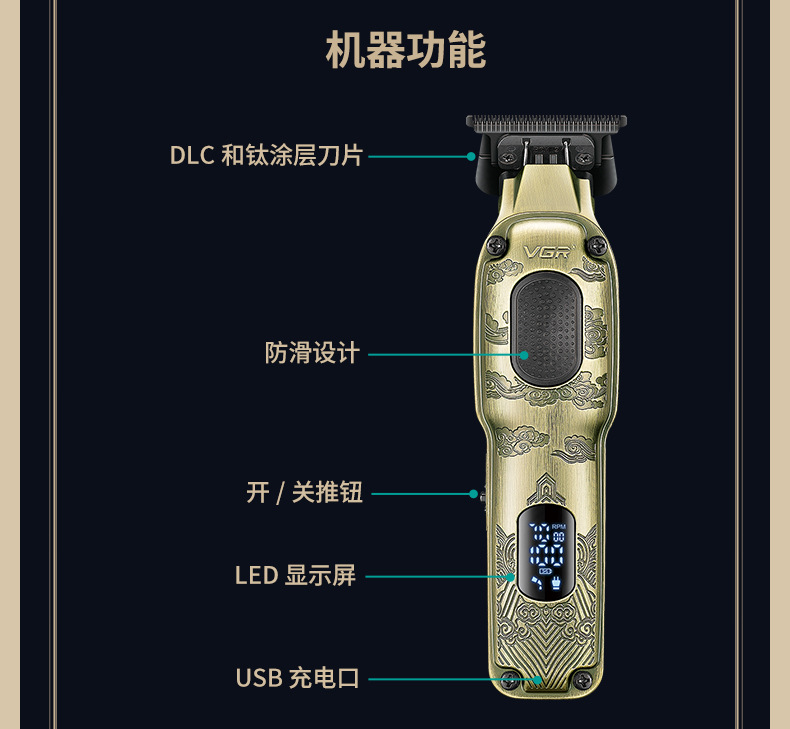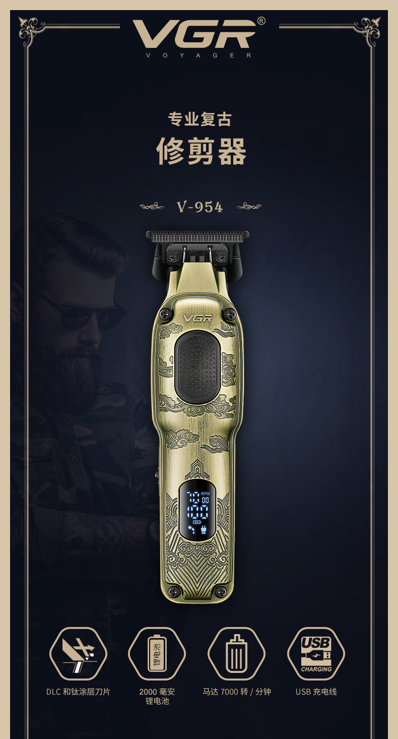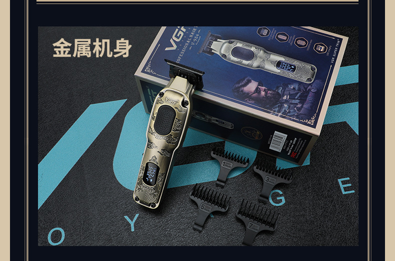VGR954跨境数显理发器油头推剪专业发廊充电式男士金属电动推子