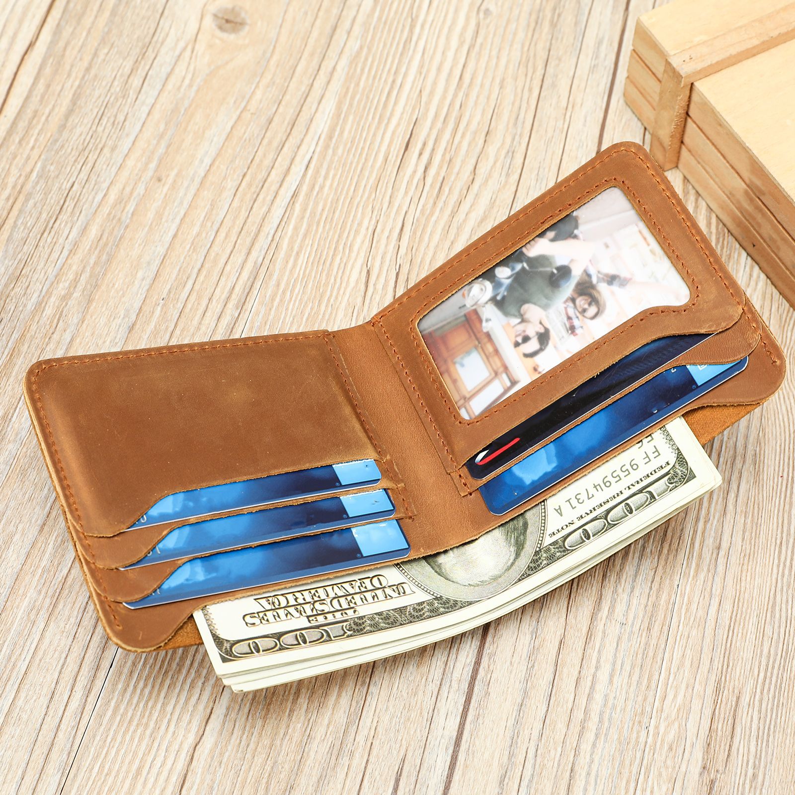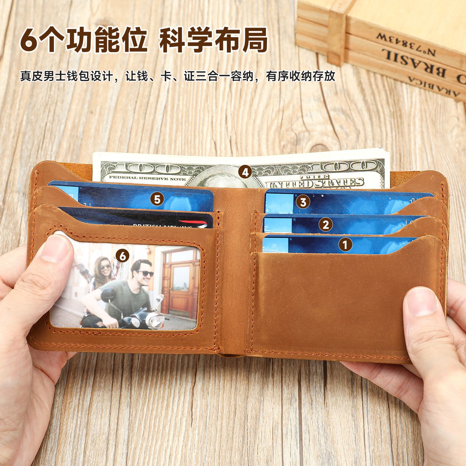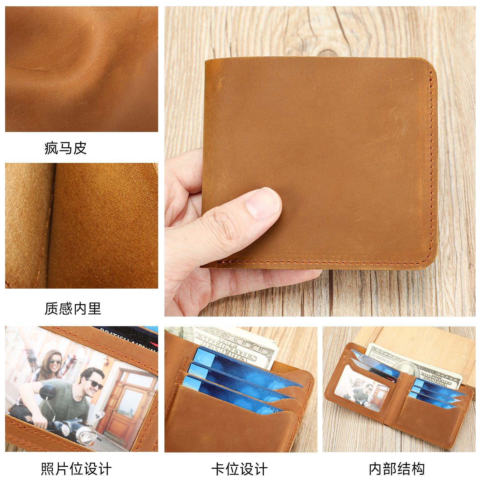亚马逊热销头层牛皮短款钱包百搭多卡位零钱包疯马皮复古卡包皮夹
