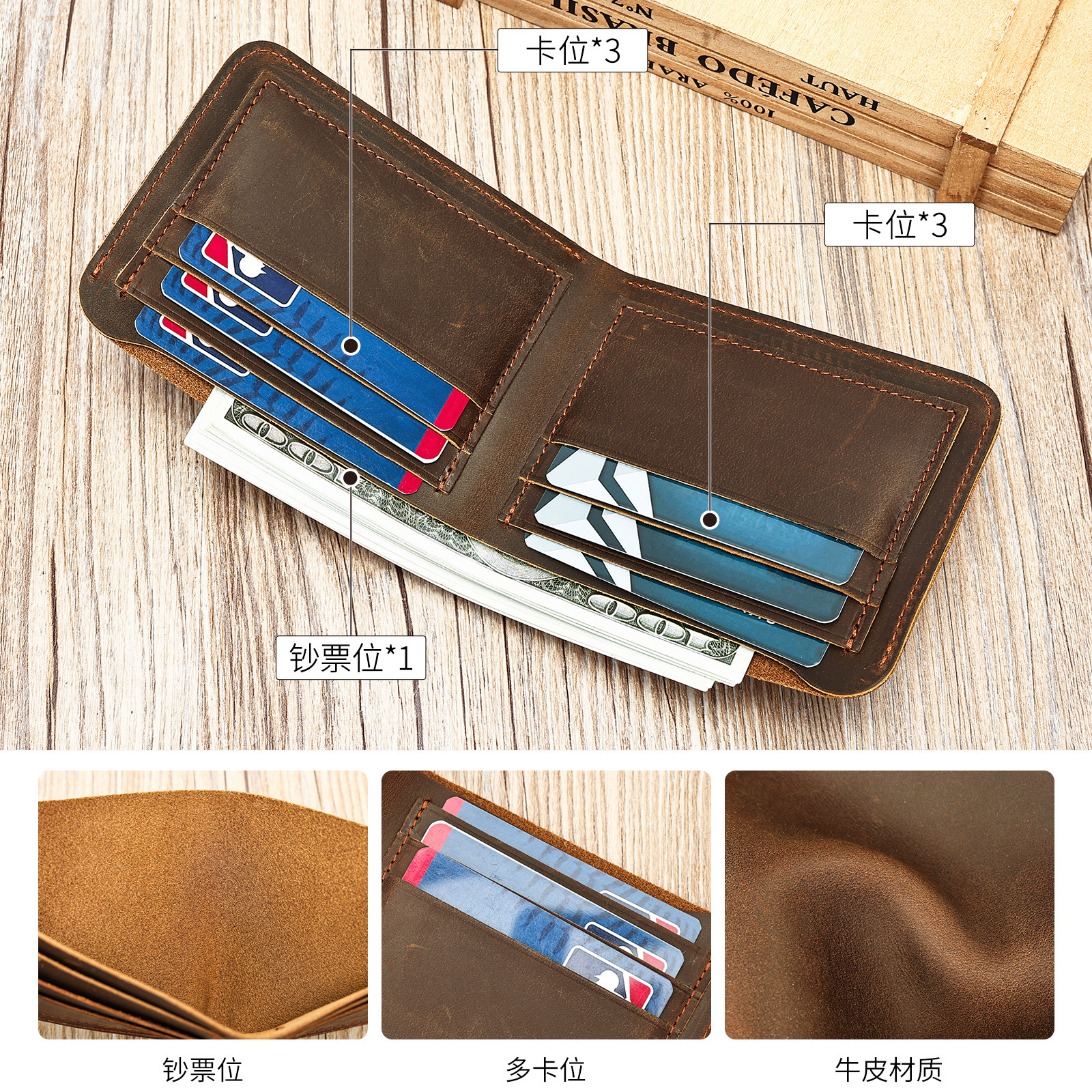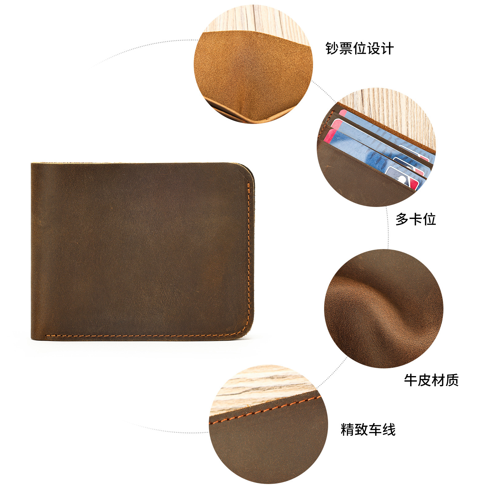 新款复古疯马皮钱包简约头层牛皮男士钱夹多功能皮夹高级感卡包男 投诉