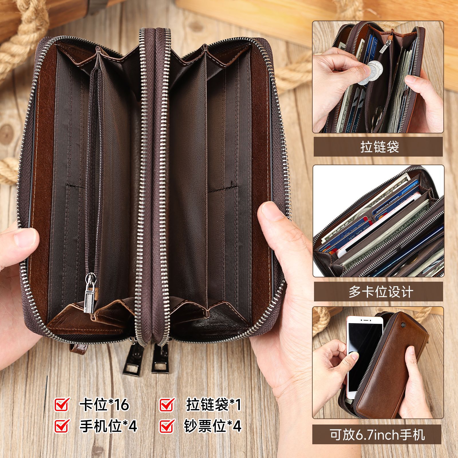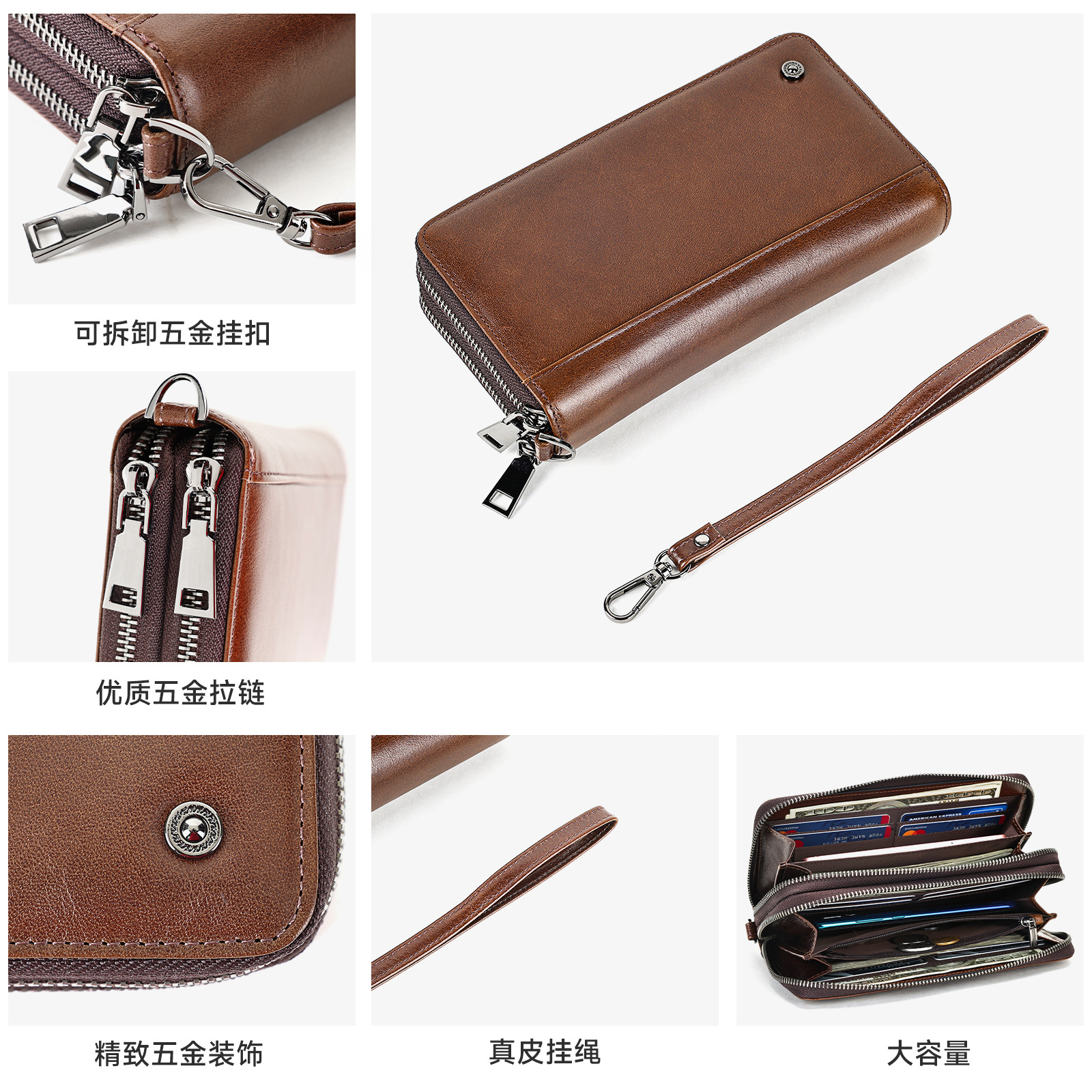 外贸新款大容量多卡位手拿包长款复古油蜡皮钱包男士商务真皮手包 投诉
