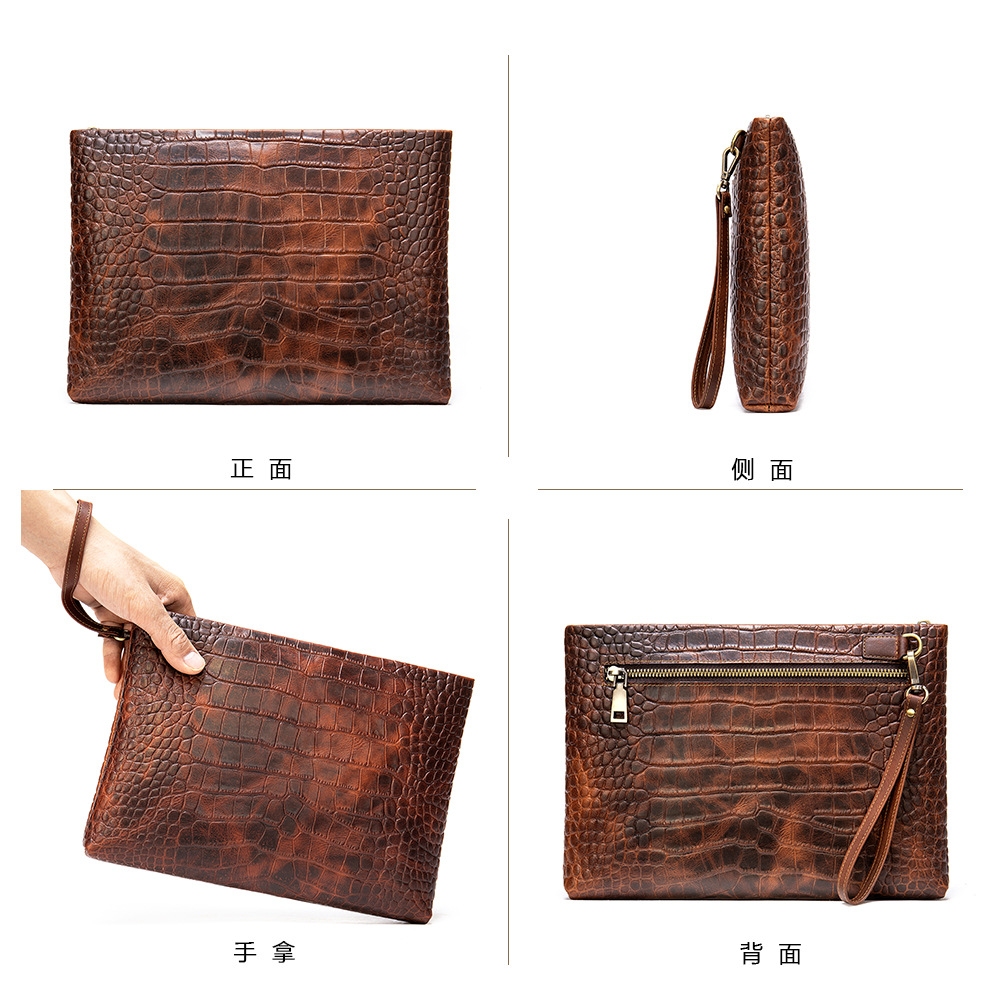 复古鳄鱼纹真皮商务差旅大容量手拿包男士高级感简约牛皮信封包男