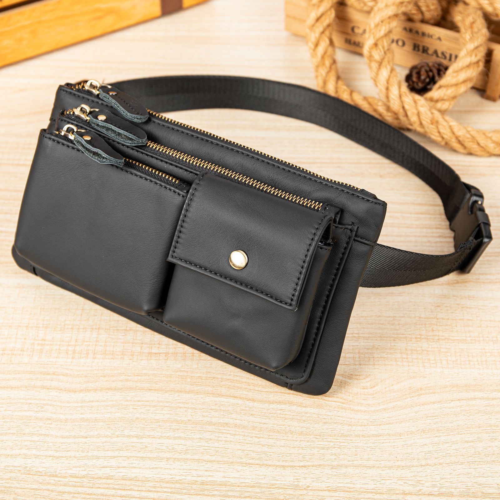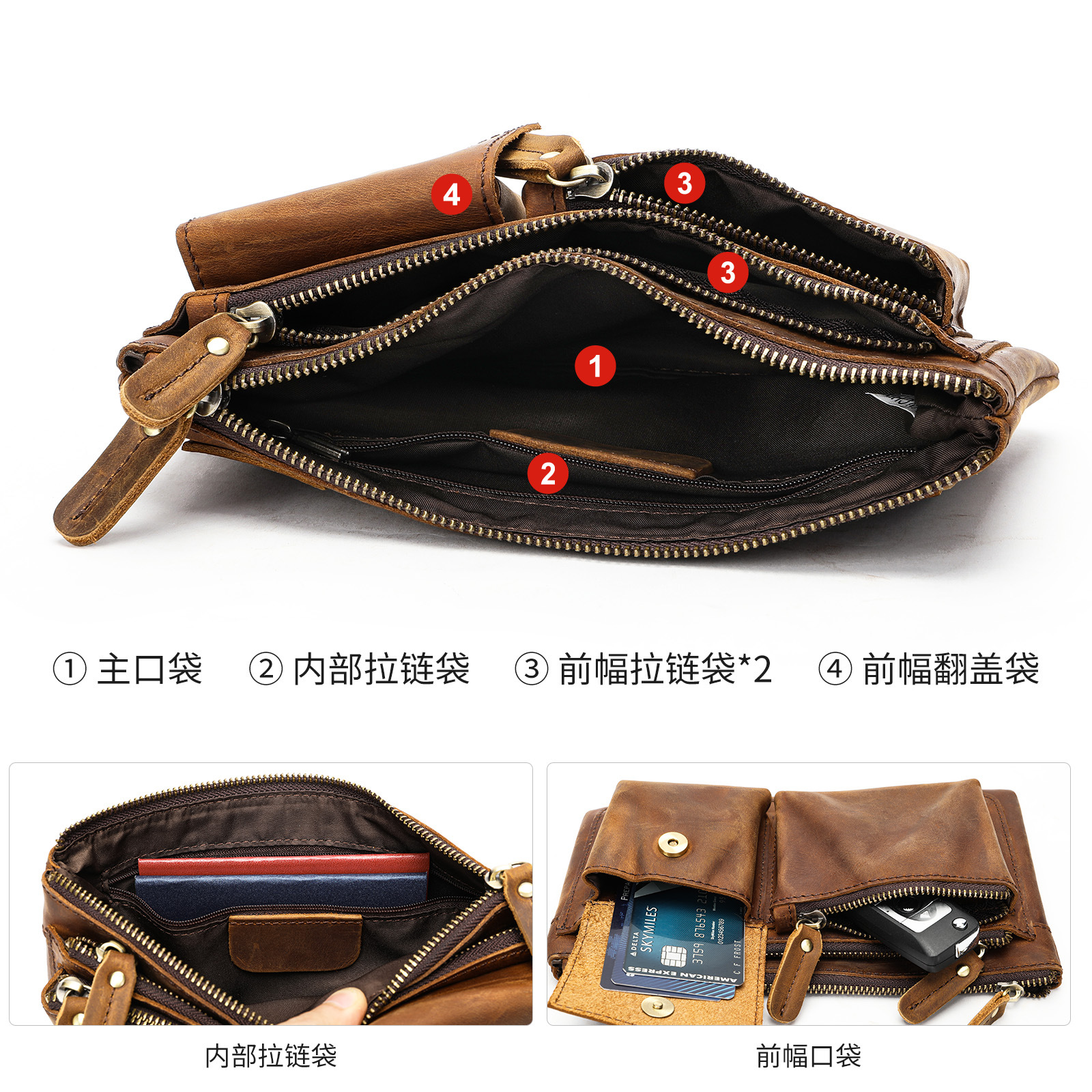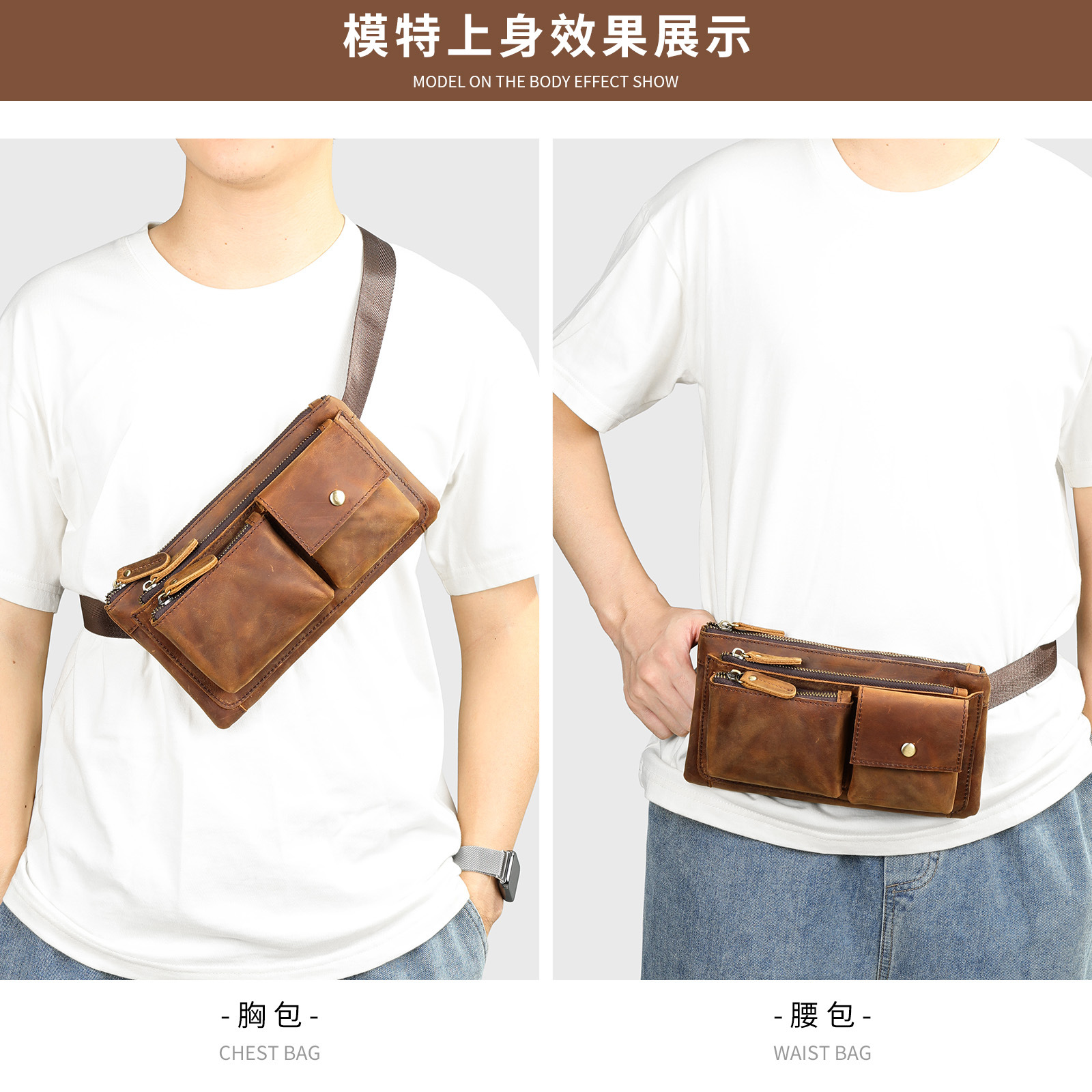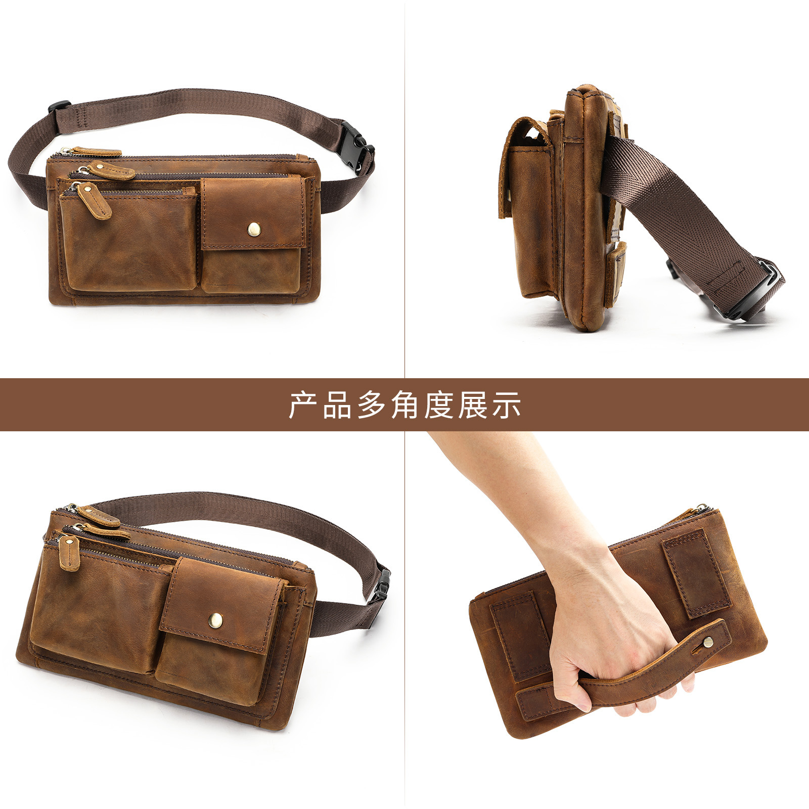 头层牛皮腰包男士胸包疯马皮复古男包多功能手拿包高级感真皮腰包