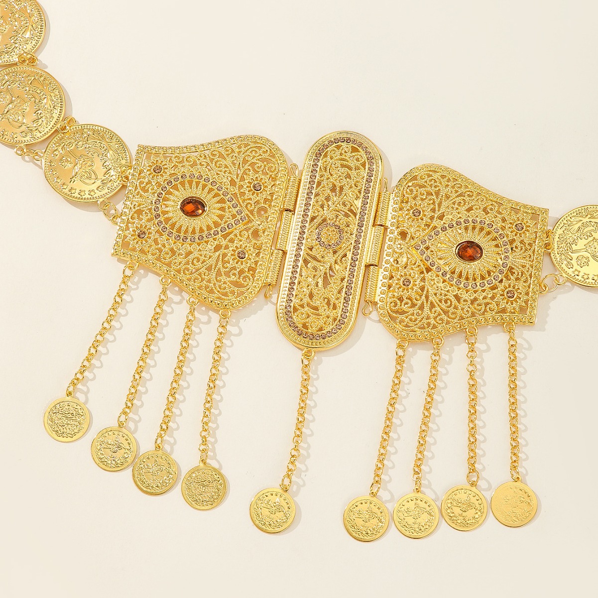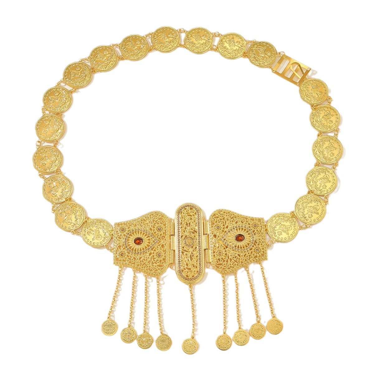 跨境民族风金属腰链女镂空雕花钱币流苏身体链异域风情服装配饰 English | 投诉