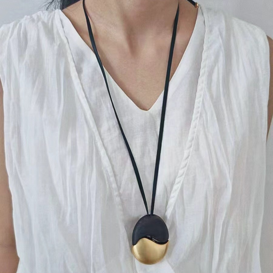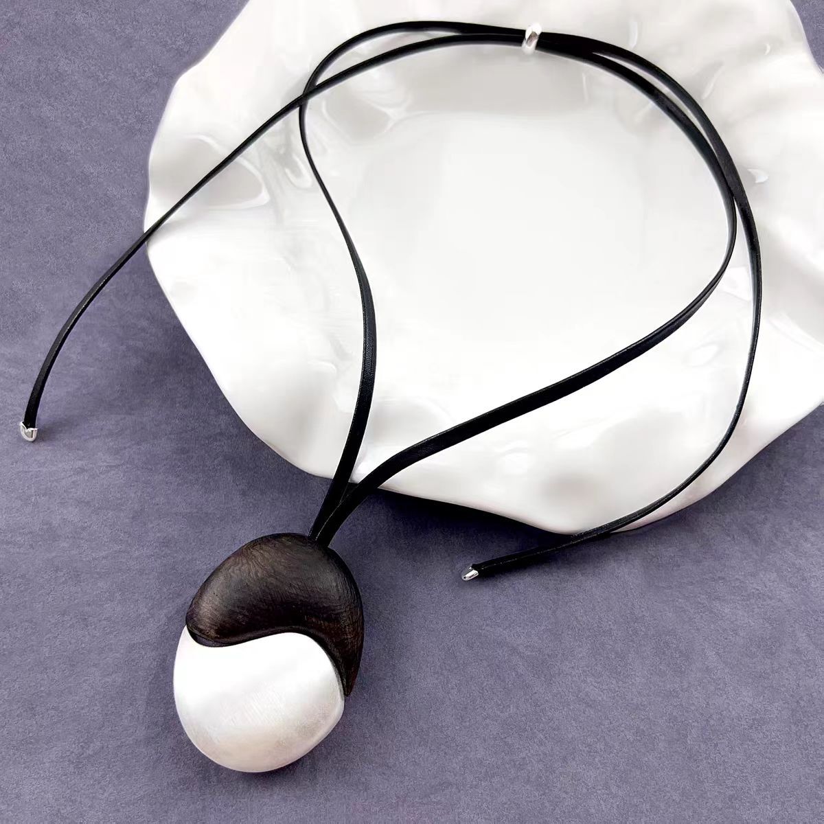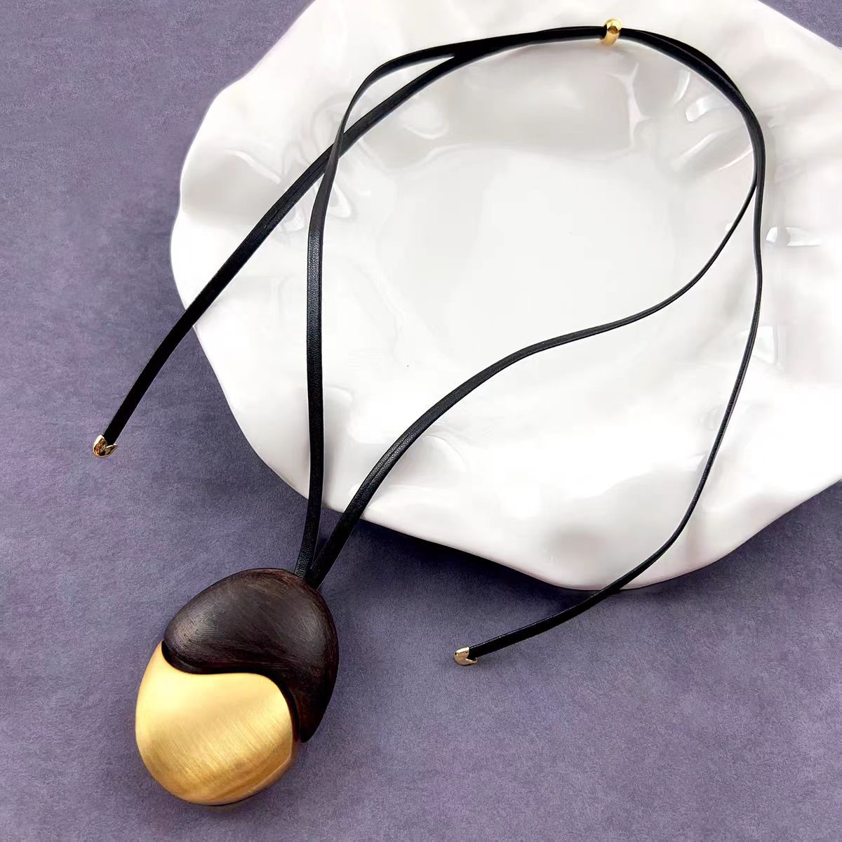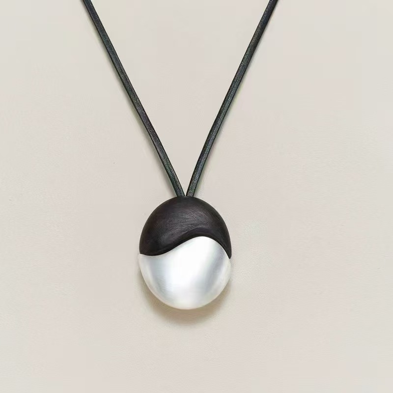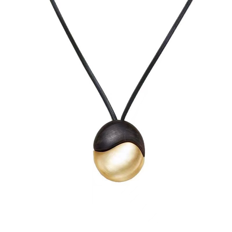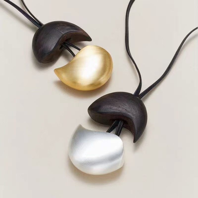 椭圆檀木拉丝皮绳项链撞色复古简约欧美小众时尚个性高级感项饰