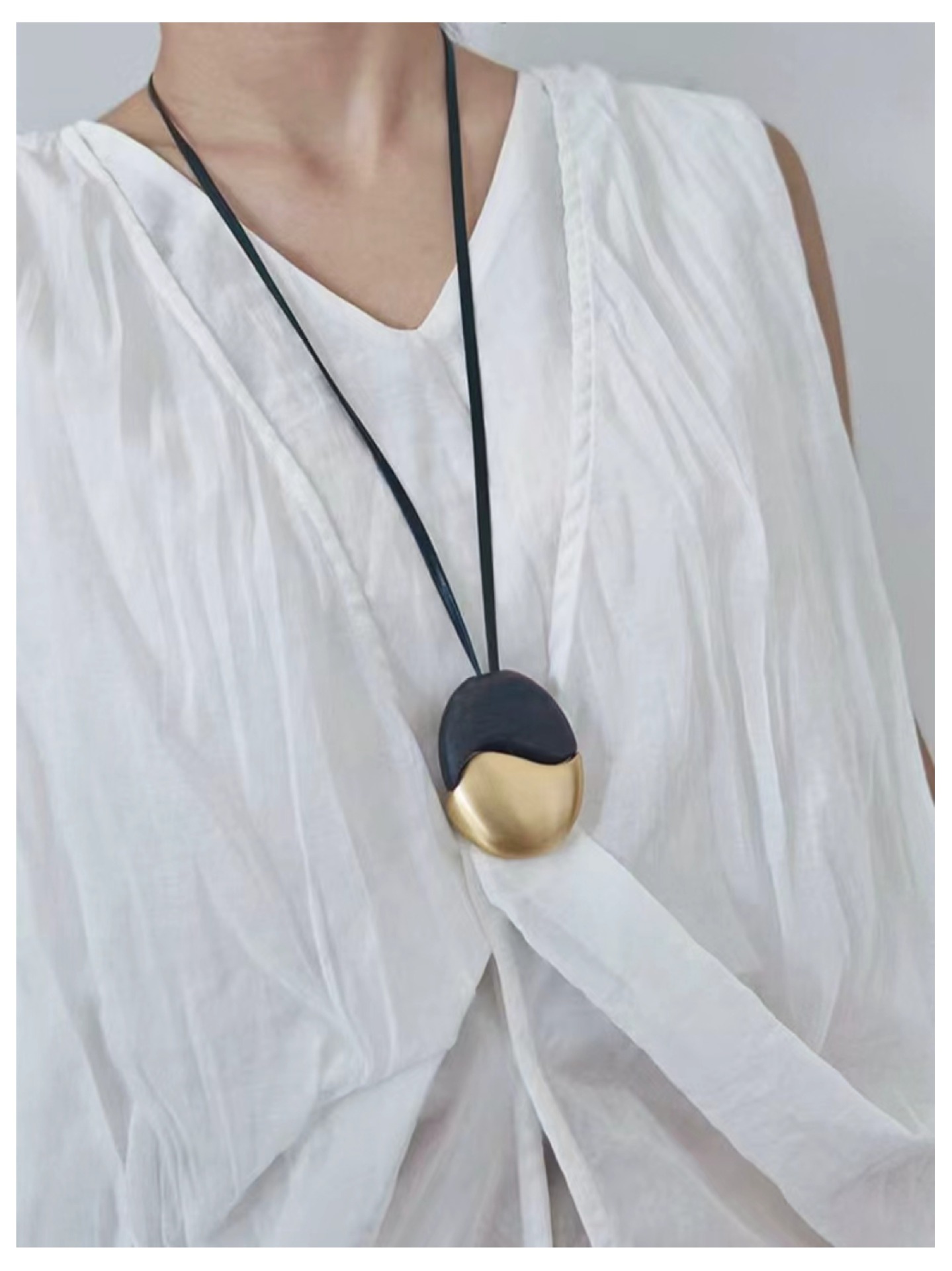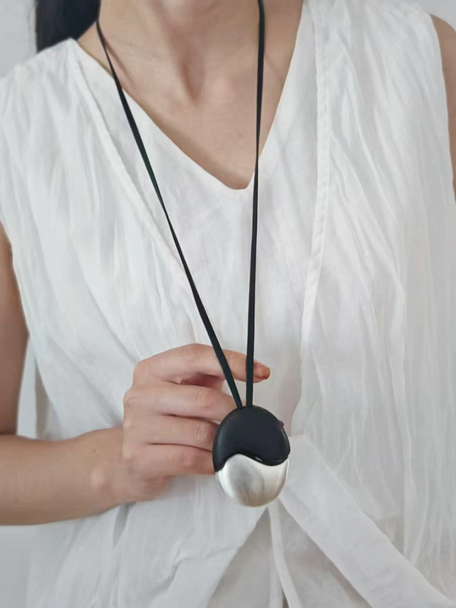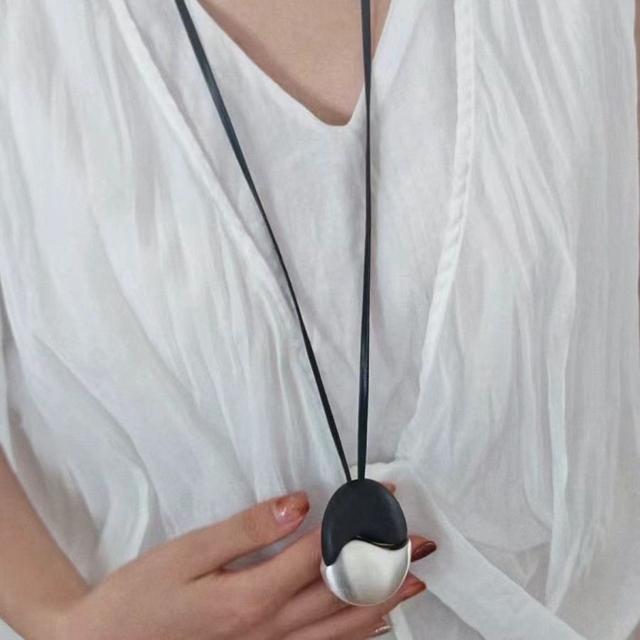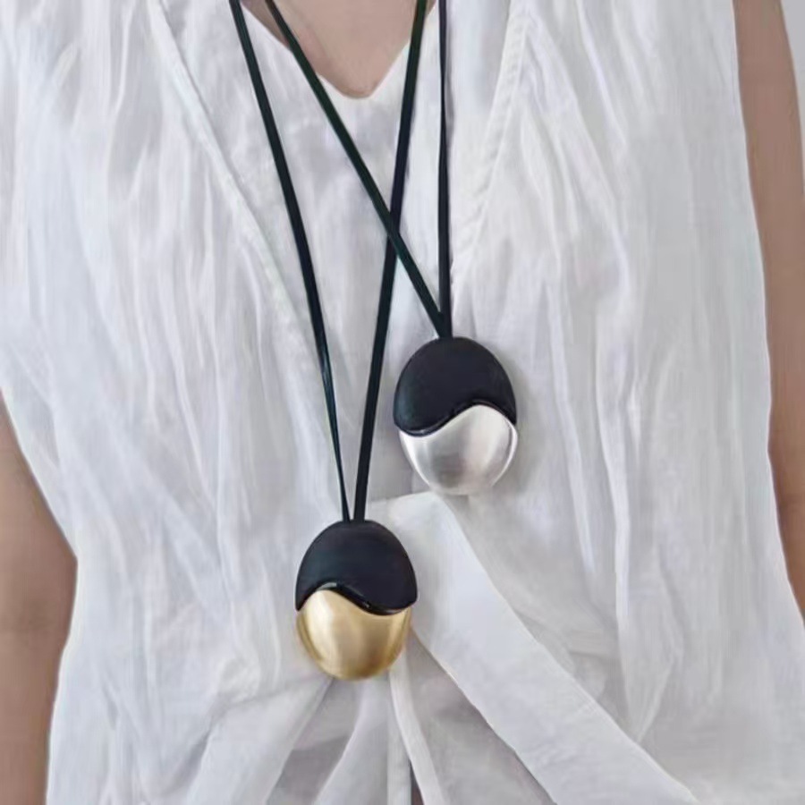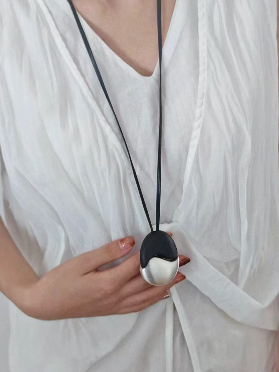 椭圆檀木拉丝皮绳项链撞色复古简约欧美小众时尚个性高级感项饰