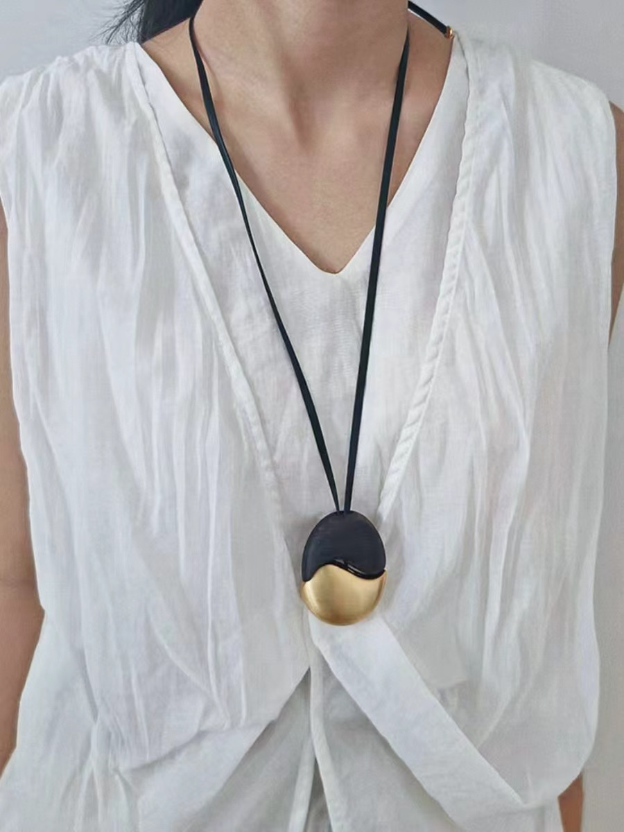 椭圆檀木拉丝皮绳项链撞色复古简约欧美小众时尚个性高级感项饰 投诉