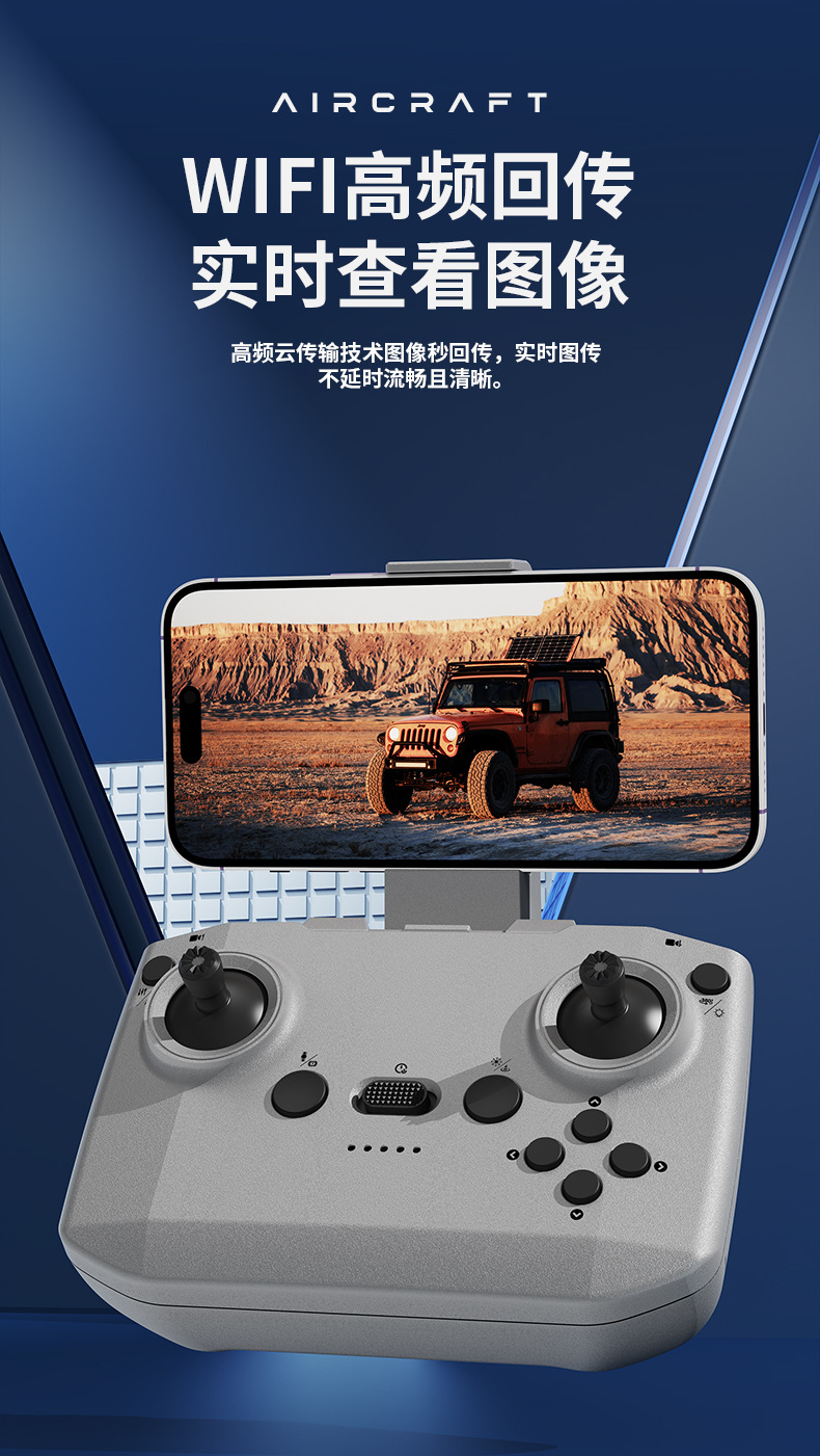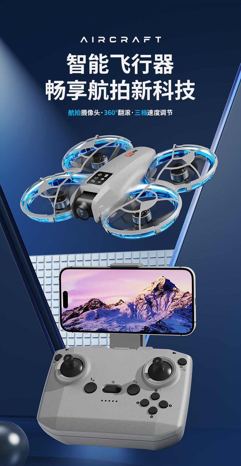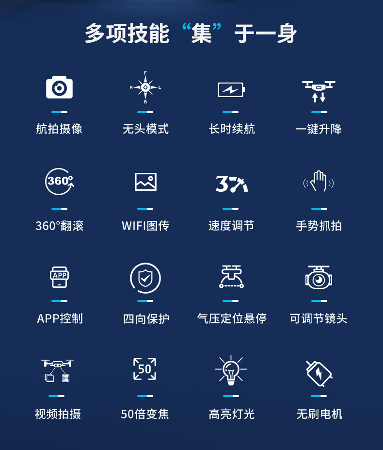 7、无人机自带WiFi信号、通过智能手机连接专用APP进行操控(一键起飞/ 一键降落/ 上升/下降/ 左/右转向/360°翻滚/无头模式/快慢档/拍照/录像/切换双摄像头/人脸识别自动拍照/重力感应/轨迹飞行/)