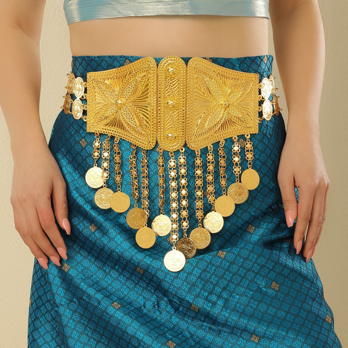 新款时尚金色钱币流苏腰链异域风情印度舞表演配饰休闲汉服身体链 English | 投诉
