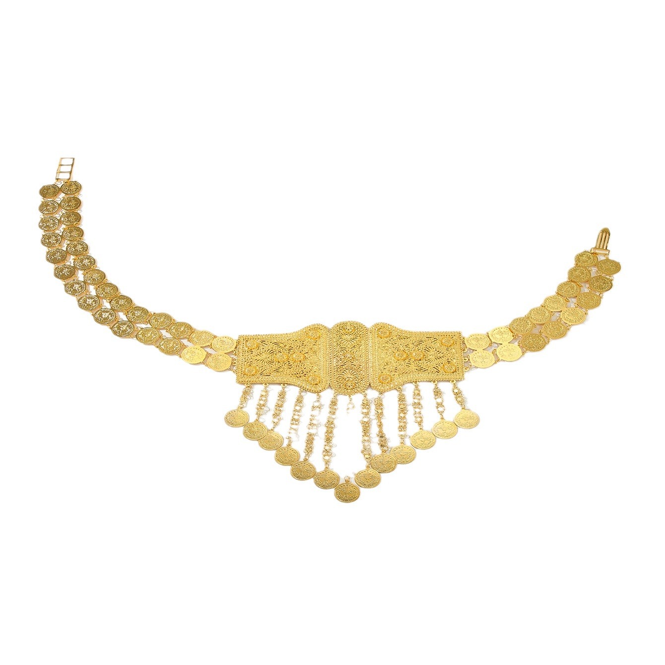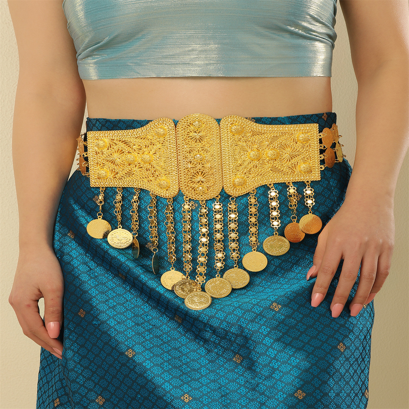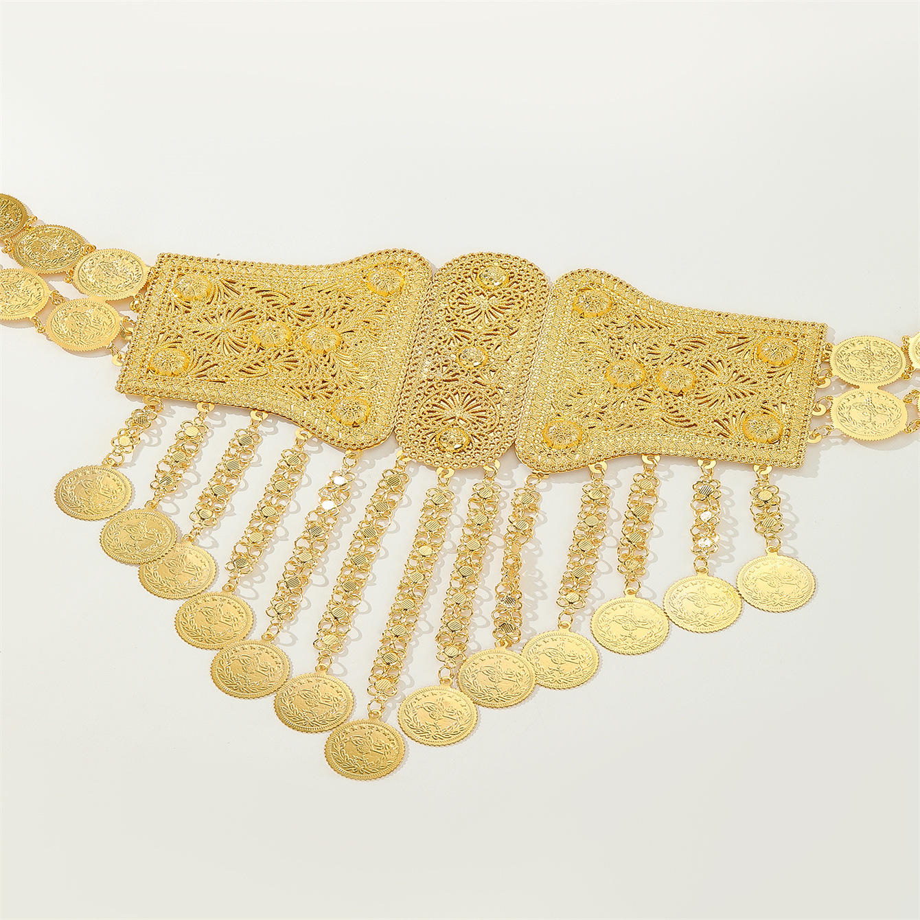 现货新款民族风金色金属腰带流苏钱币吊坠身体链重工不规则腰链 English | 投诉