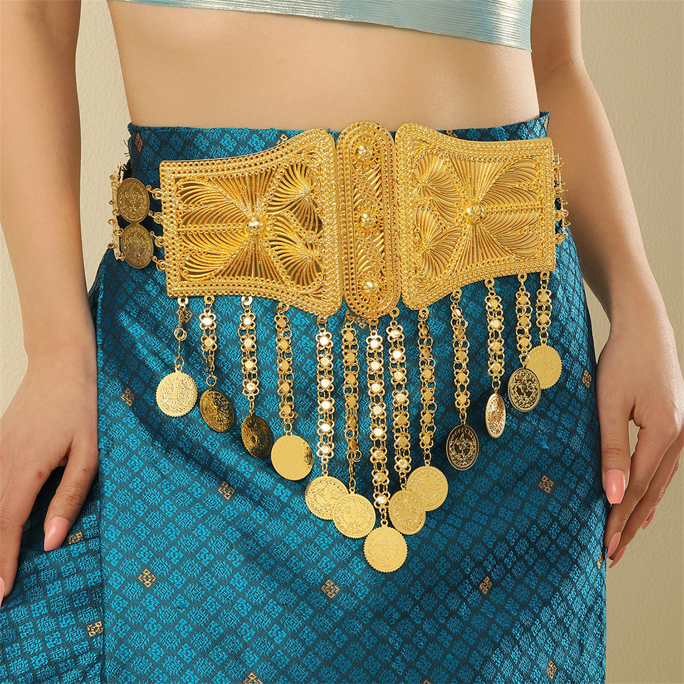 厂家直供配饰美雕刻图腾金属腰链异域风钱币流苏身体链肚皮舞配饰 English | 投诉