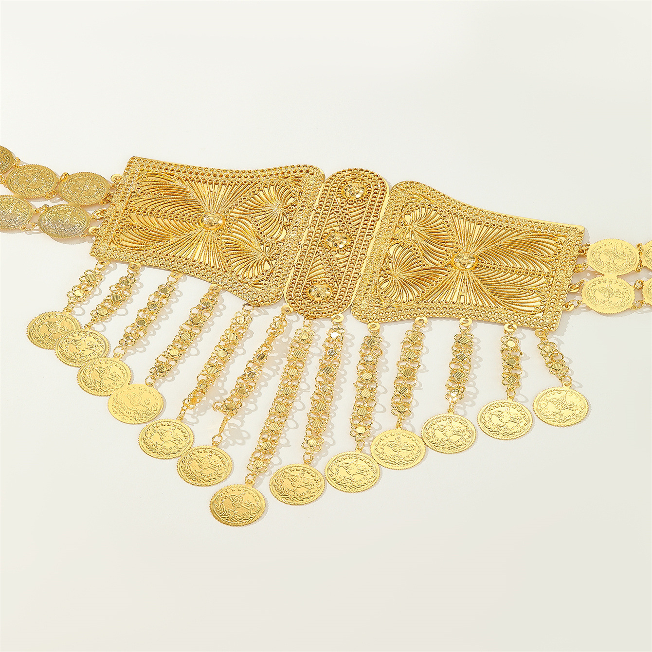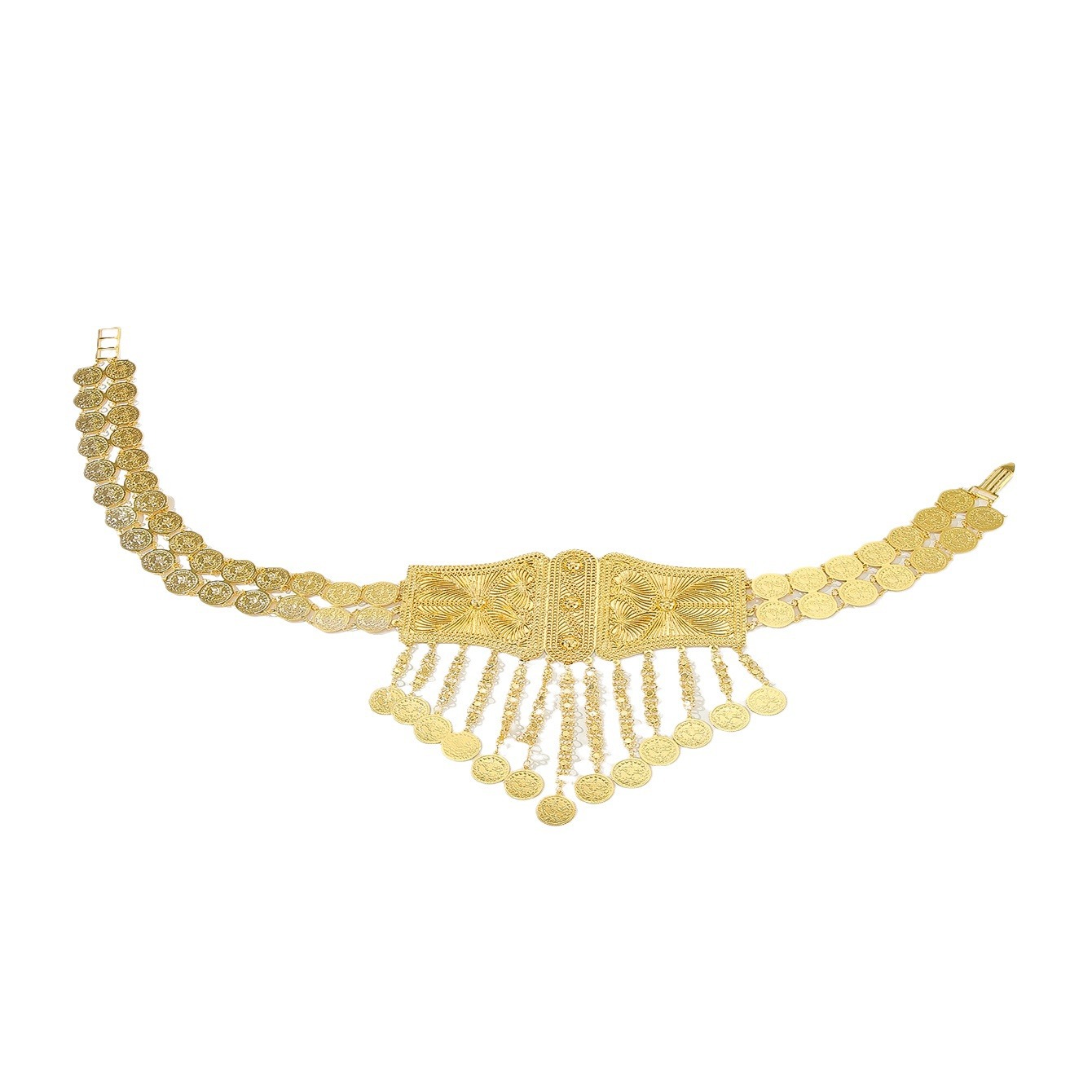 厂家直供配饰美雕刻图腾金属腰链异域风钱币流苏身体链肚皮舞配饰