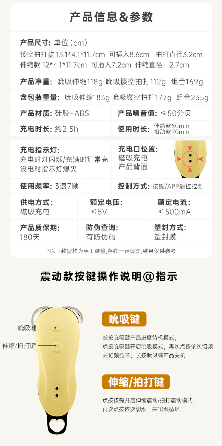产品重量(g): 吮吸伸缩款:118g 吮吸镂空拍打款:112g组合款:169g