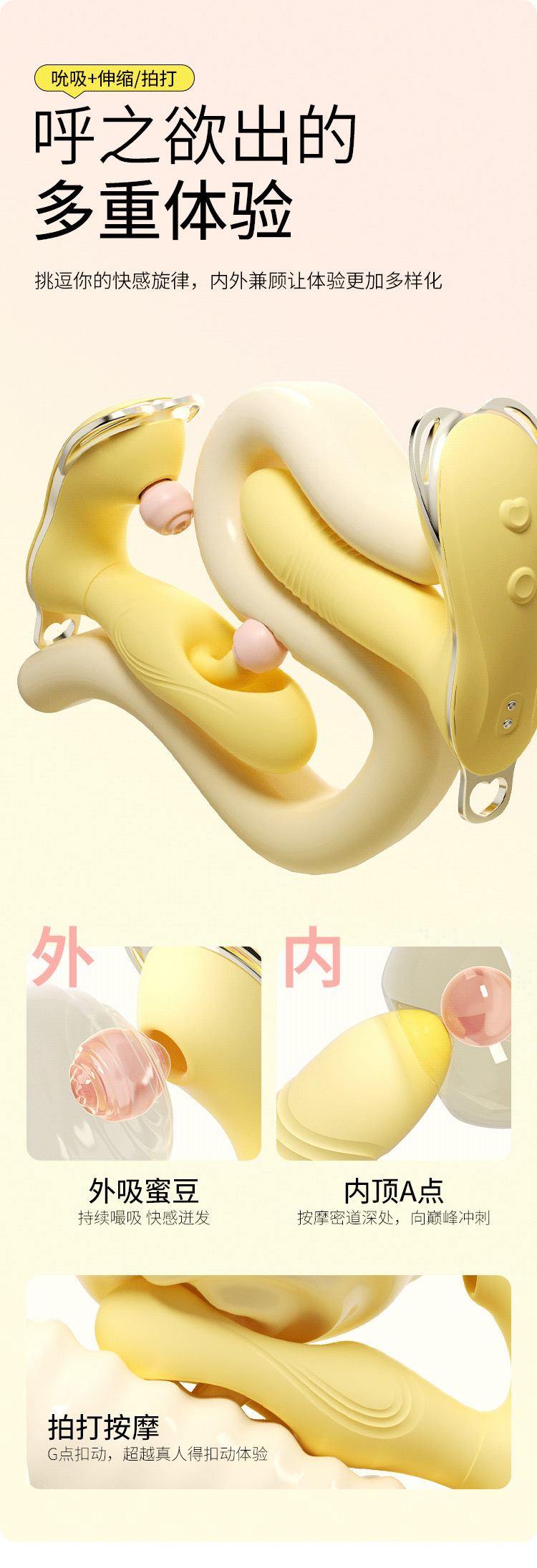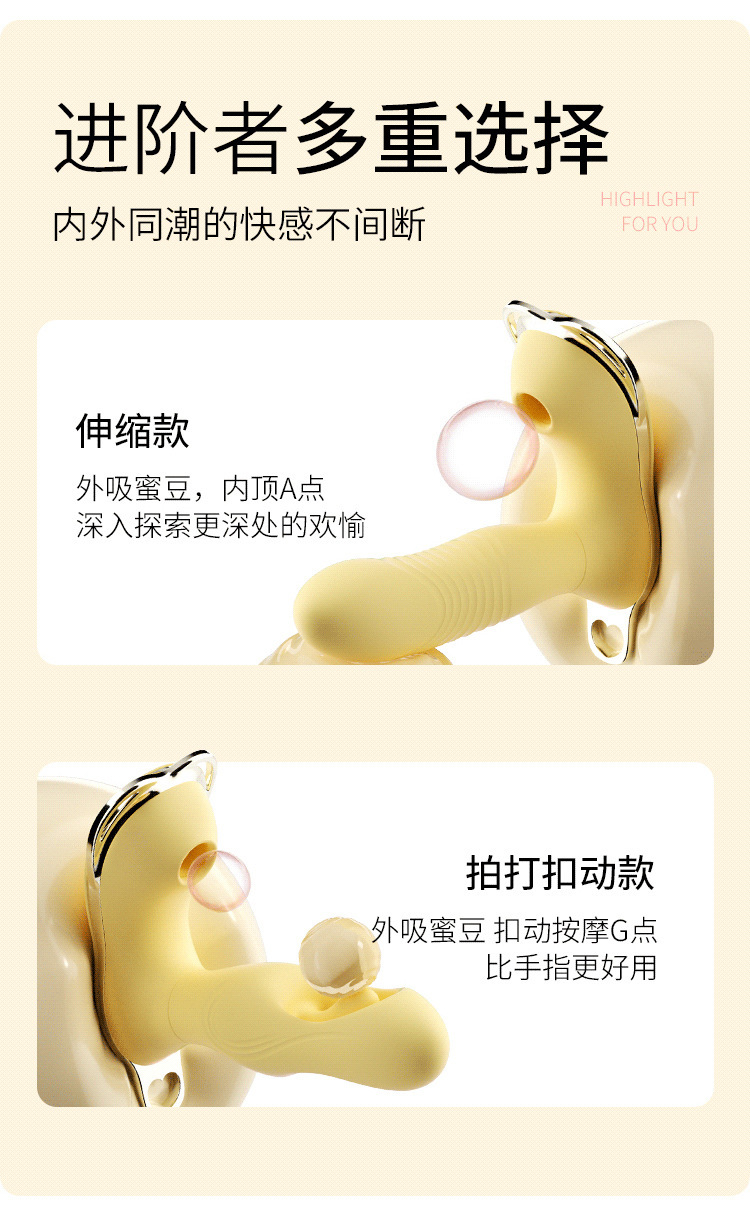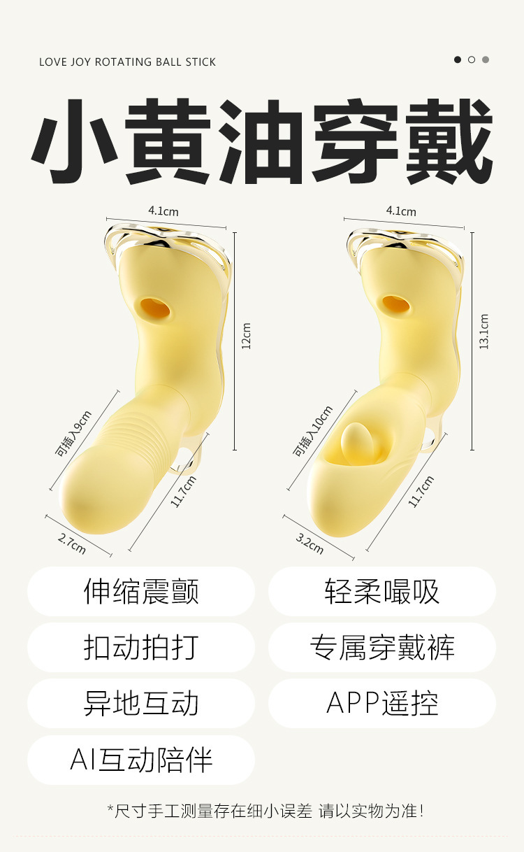 产品尺寸(cm):吮吸镂空拍打款:13.1*4.1*11.7cm 插入尺寸:8.6cm 拍打直径:3.2cm 吮吸伸缩款:12*4.1*11.7cm 插入尺寸:7.2cm 伸缩直径:2.7cm