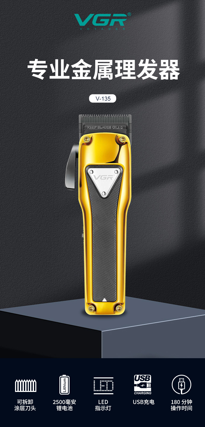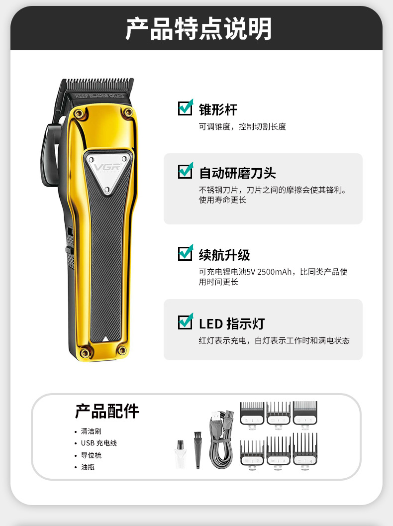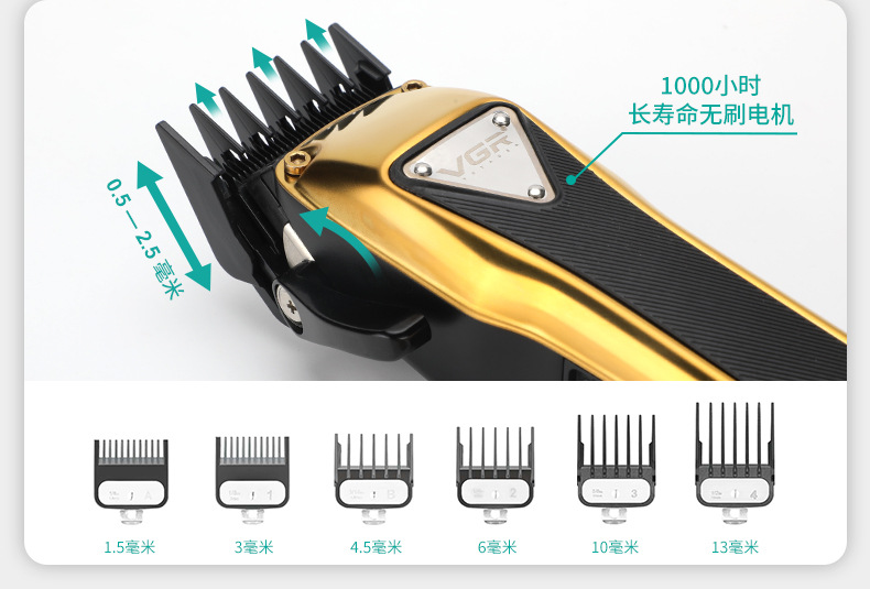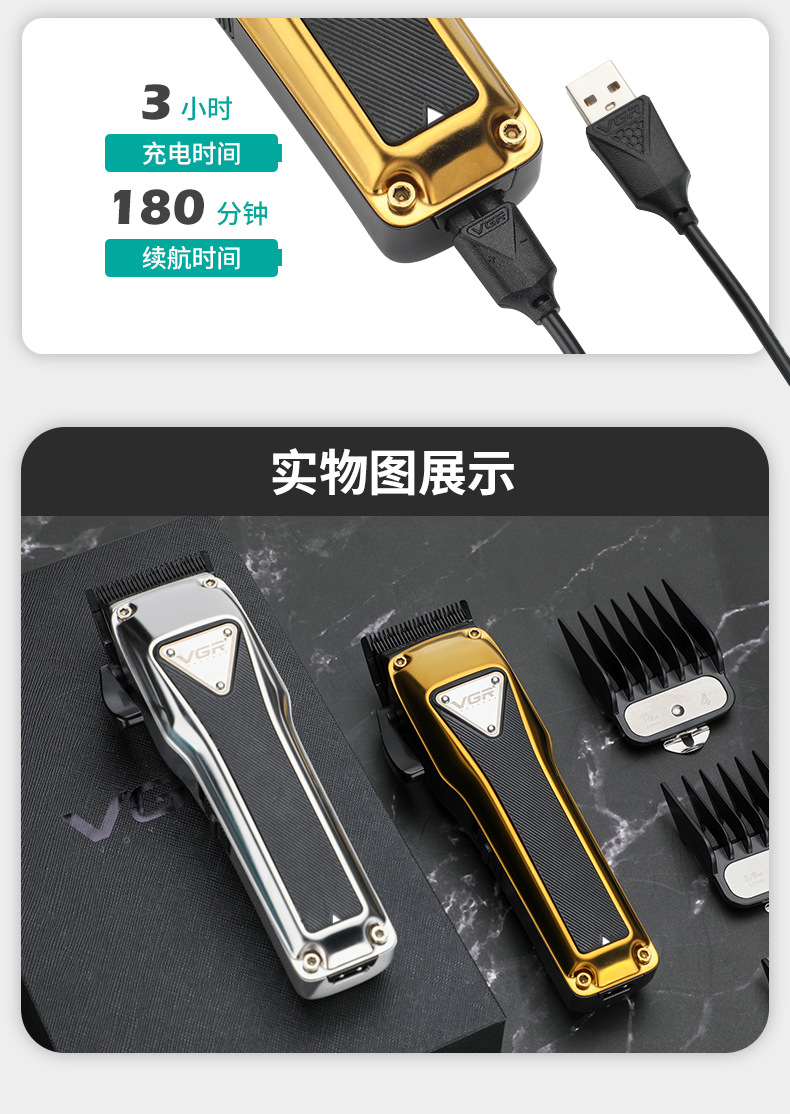 品牌: VGR/沃吉 刀头材质: 钛合金 电源方式: 充电款 清洁方式: 无水洗 内置蓄电池容量: 1200mAh-2000mAh(含) 适用人群: 通用 是否内置电池: 内置电池 电机类型: 有刷电机 规格: V-135 金色,V-135 银色 是否防水: 否 外壳工艺: 喷涂(UV漆,橡胶漆,金属漆,钢琴烤漆, 续航时长: 1-3h(含) 是否适用宠物: 否 噪音: 46-70db 重量: 0.6 kg/个