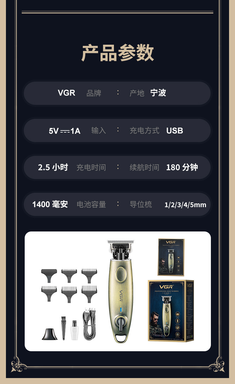 品牌: VGR/沃吉 刀头材质: 钛合金 电源方式: 充电/电源两用式 清洁方式: 无水洗 适用人群: 通用 电机类型: 有刷电机 型号: V-978 规格: V-978 产地: 中国 是否防水: 否 主要下游平台: ebay,亚马逊,wish,速卖通,独立 主要销售地区: 非洲,欧洲,南美,东南亚,北美,东北亚, 有可授权的自有品牌: 是 是否跨境出口专供货源: 是 是否专利货源: 否 外壳工艺: 电镀 额定电压: ≤36V 续航时长: 1-3h(含) 重量: 0.6 kg/个