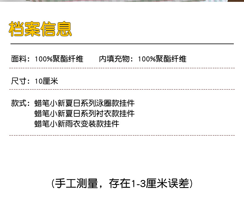 填充材质: PP棉 品牌: 其他 适用年龄: 少年(7-14岁) 造型类别: 卡通 毛绒分类: 优质毛绒 是否专供外贸: 否 所属分类: 毛绒公仔 造型是否卡通、动漫: 是 包装方式: 网袋 是否多功能: 否 货号: 乐贝儿 加工定制: 是 加工方式: 来样定制 卡通、动漫类型: 蜡笔小新 是否有导购视频: 是 产地: 中国 是否外贸: 是 3C配置类别: 14岁以上的玩具 颜色: 雨衣小新挂件粉色,夏日小新挂件黄色,夏日 高度: 10厘米