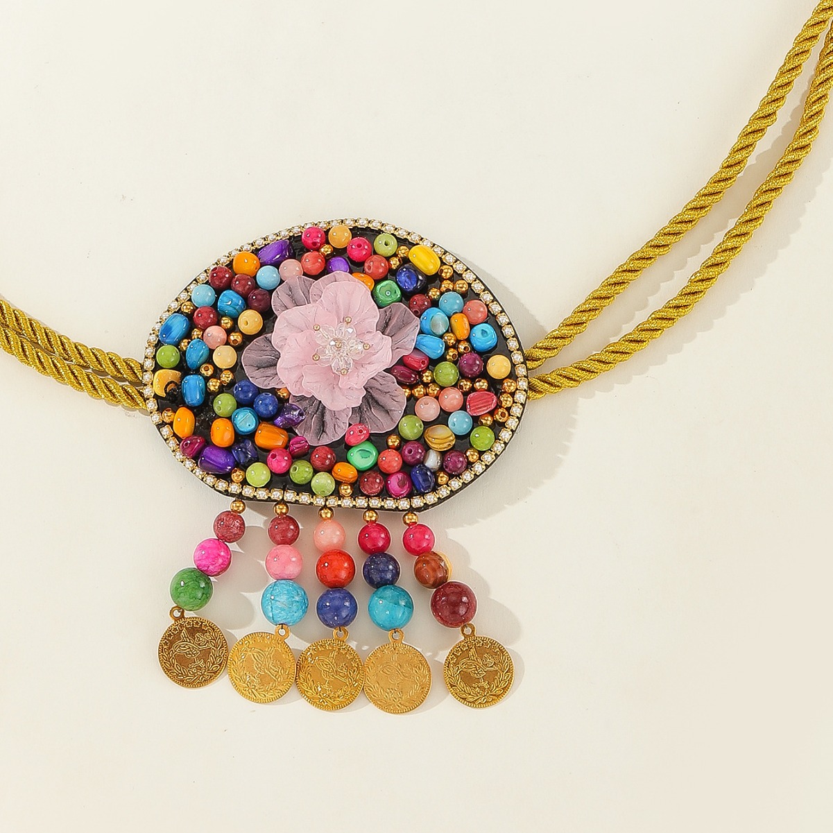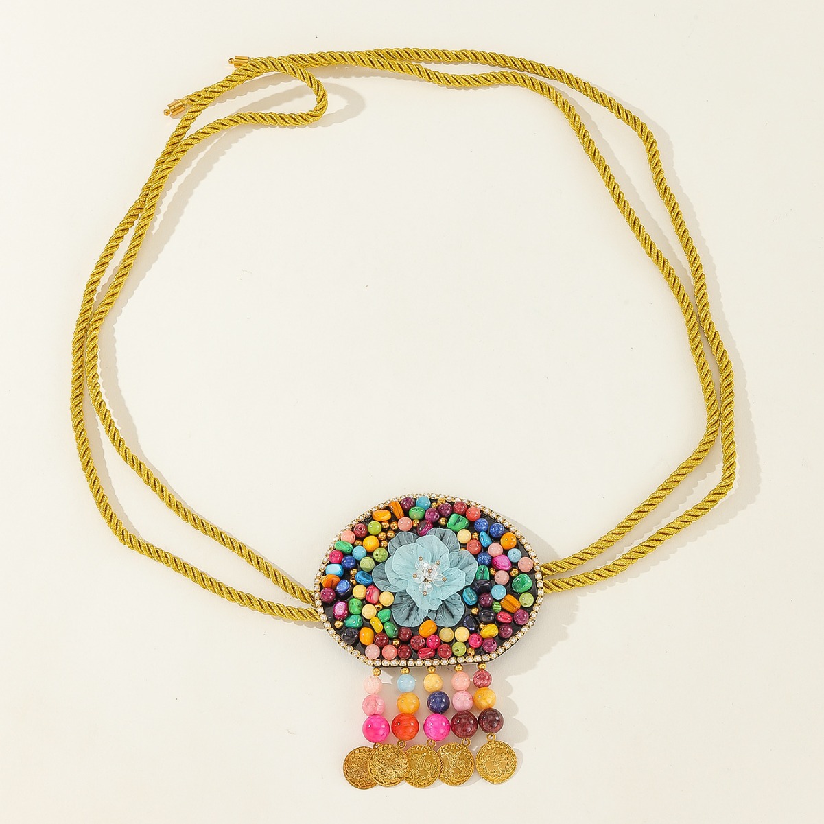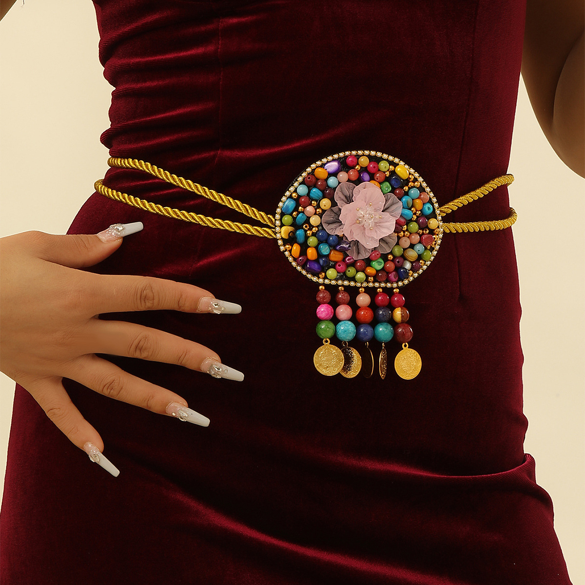 傣族民族风身体链彩色串珠腰链舞蹈表演装饰腰链金币流苏腰带批发 English | 投诉