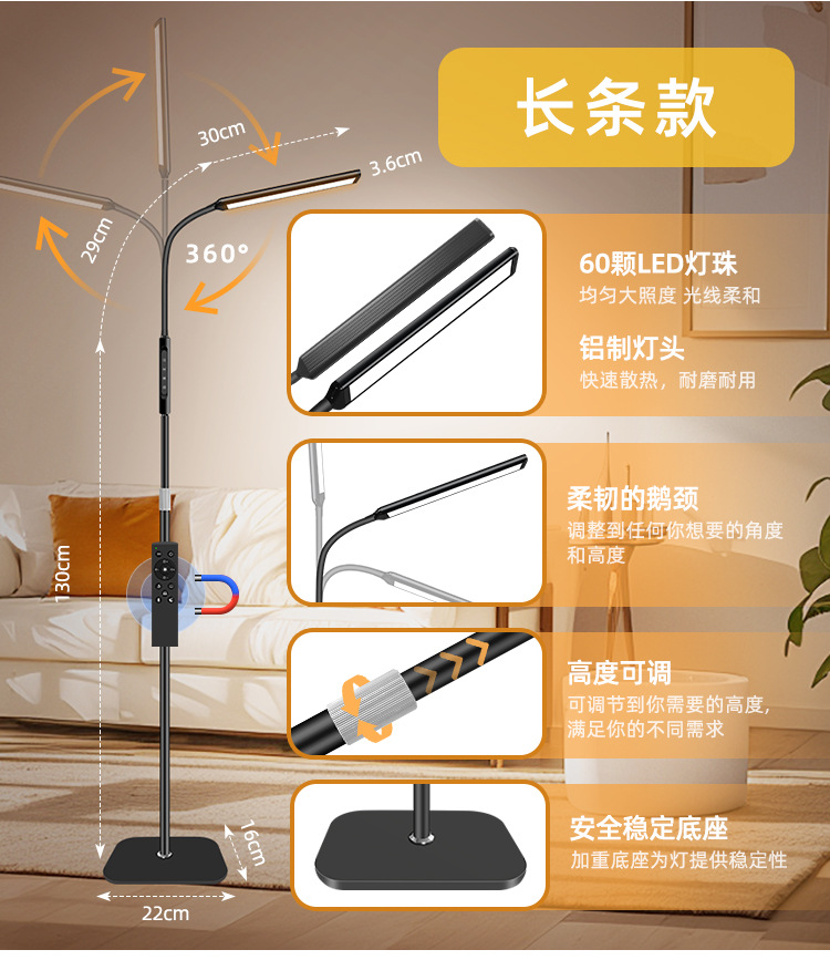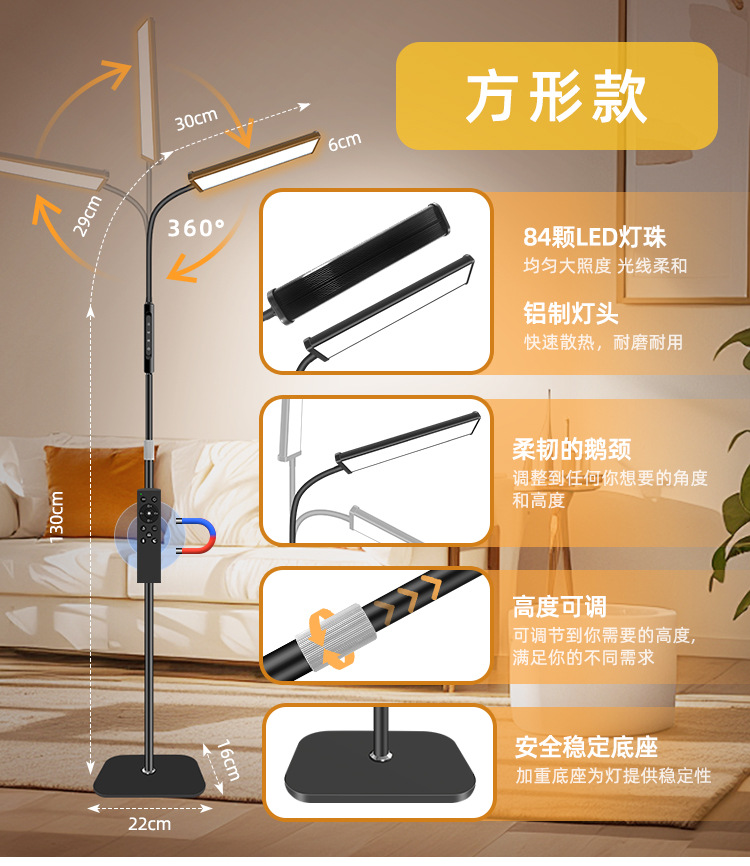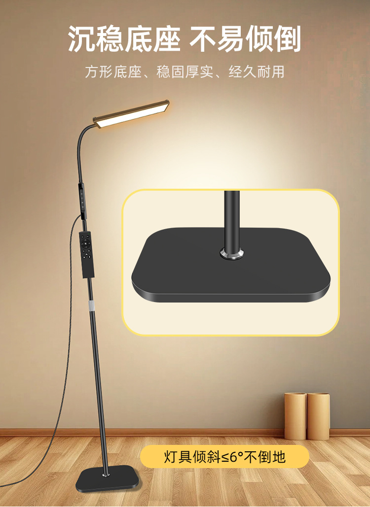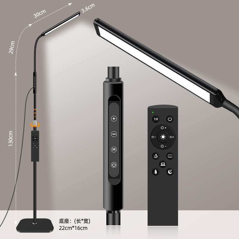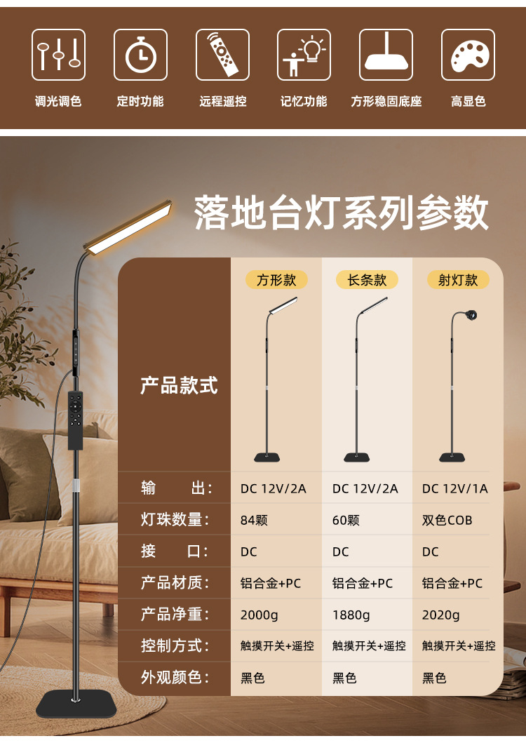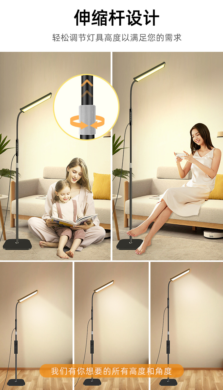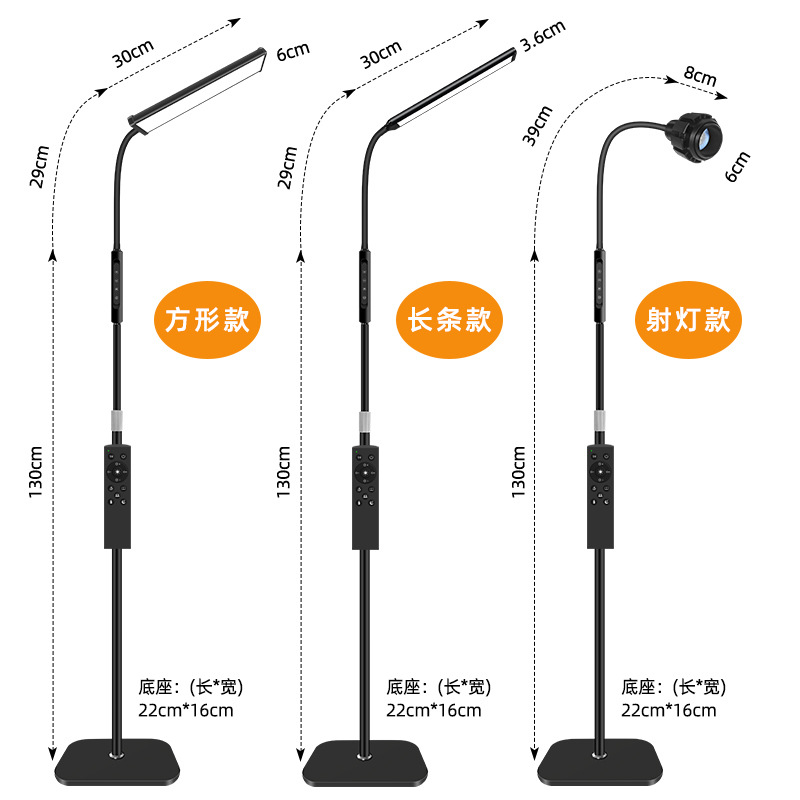 三款产品采用加厚方形底盘、伸缩杆设计、可随意调节你想要的高度!私模触摸开关、带遥控器、可无极调光、五档调节色温、调节不同模式、带记忆功能、可定时:(0.5H/1H/2H)。无可视频闪、无明显光斑、发光均匀、柔光护眼。采用DC12V适配器!