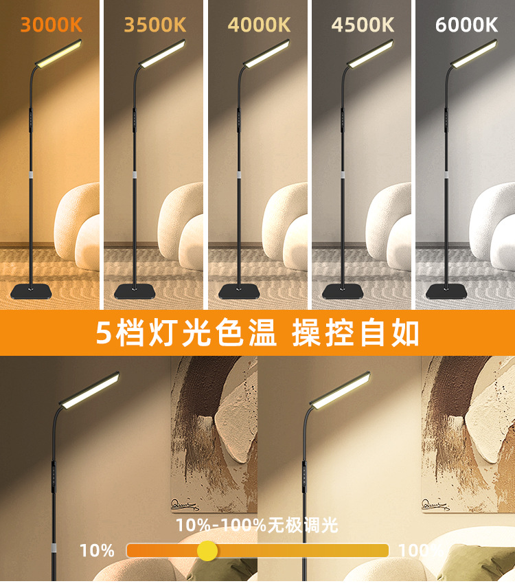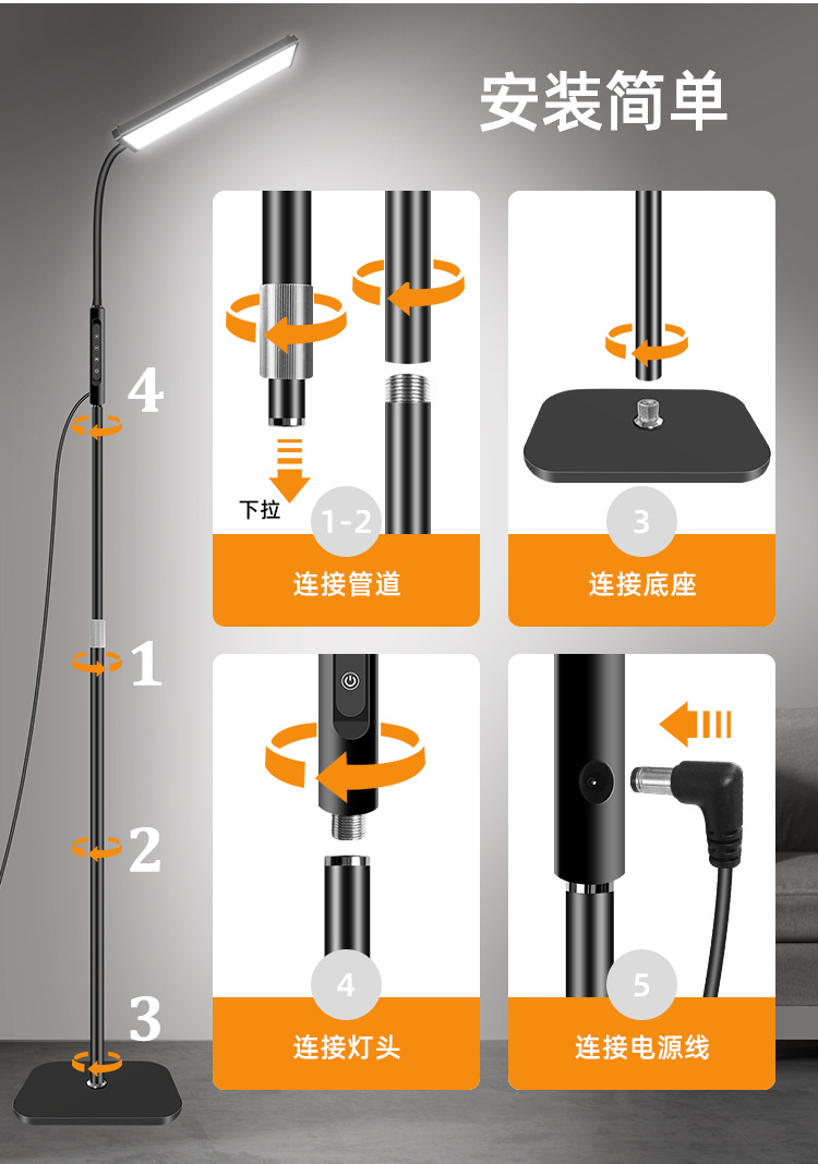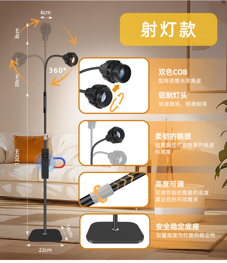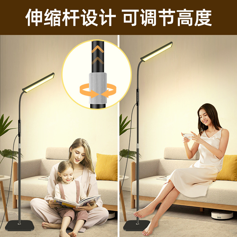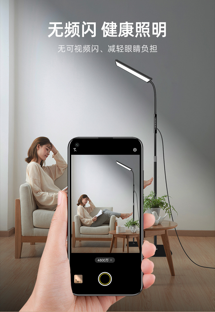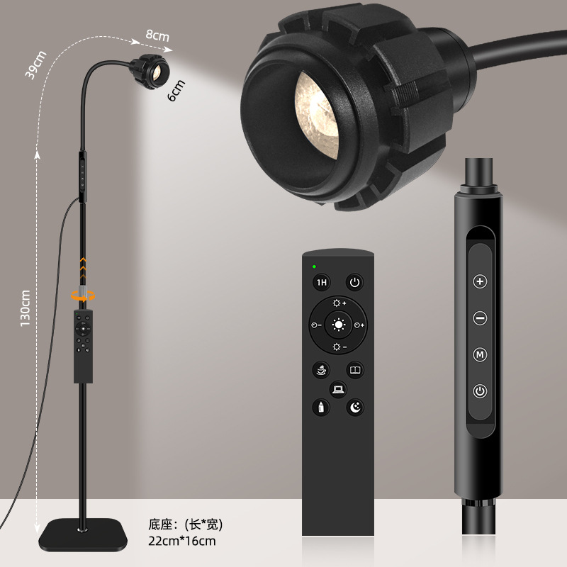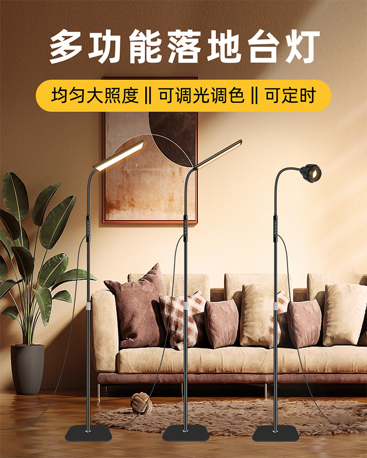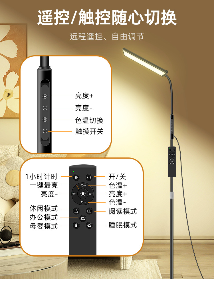 三款产品采用加厚方形底盘、伸缩杆设计、可随意调节你想要的高度!私模触摸开关、带遥控器、可无极调光、五档调节色温、调节不同模式、带记忆功能、可定时:(0.5H/1H/2H)。无可视频闪、无明显光斑、发光均匀、柔光护眼。采用DC12V适配器!