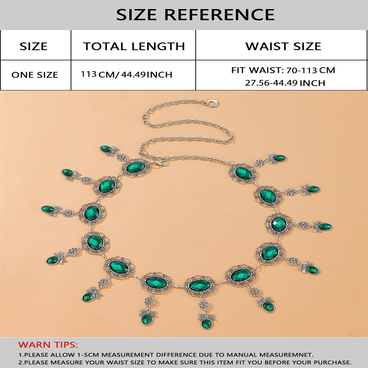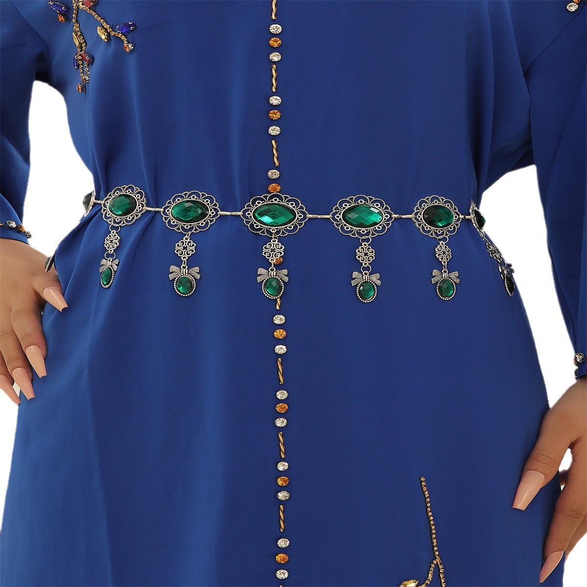 欧美热卖绿宝石吊坠腰链复古花纹扣腰链腰带大衣礼服腰封配饰批发 English | 投诉