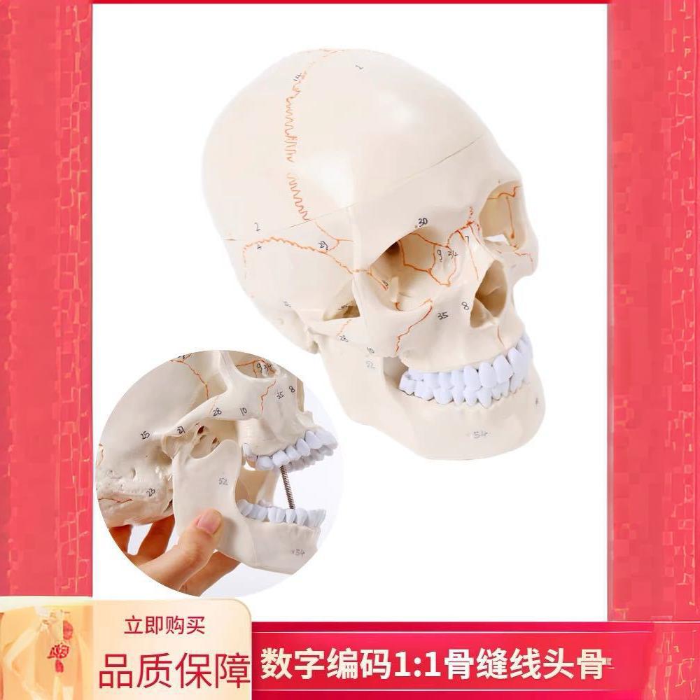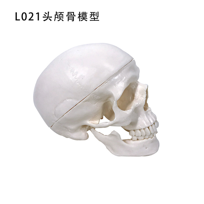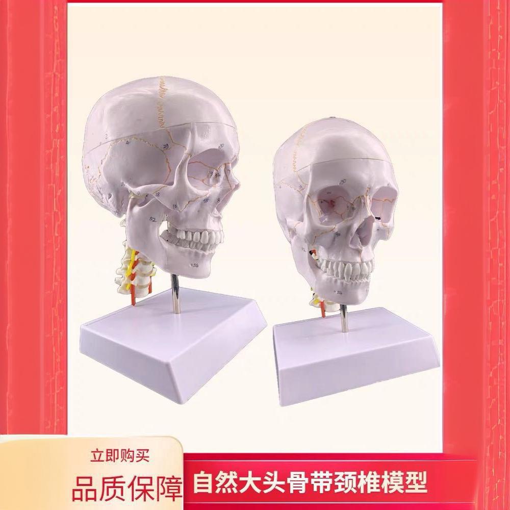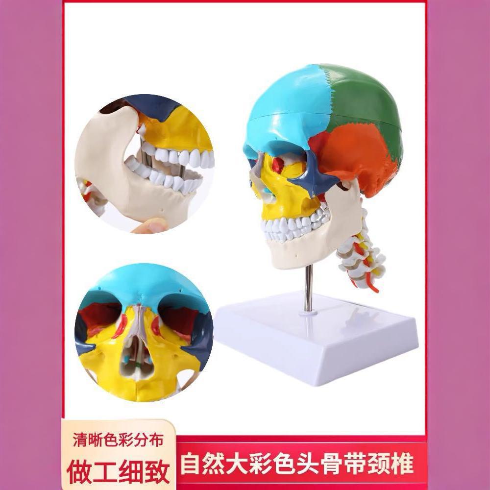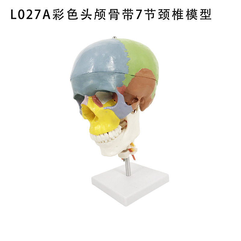模型大小为20cm*14cm*17cm模型由头颅骨和7节颈椎串制成一个整体,模型用不同颜色区分正常人体头颅骨的功能区域,并带7节颈椎、椎动脉、脊神经串制而成,颅盖可打开,下颌骨可灵活活动,示颅骨和颈椎的组成和形态结构