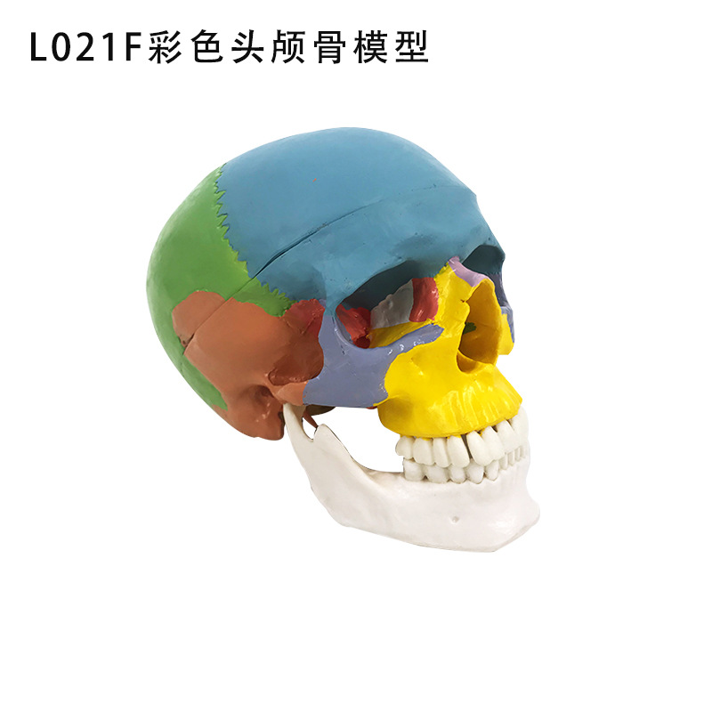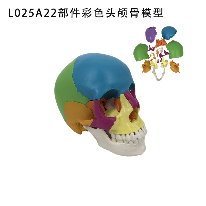 模型大小为20cm*14cm*17cm模型由22部件组成,由各部分颅骨串制于铁丝上,固定在底座上,以便于观察各骨之间的毗邻关系以及内外两侧、上下各面的结构特点及孔、管、沟、裂等,显示分解的22部件颅骨形态结构,用不同颜色区别说明22部分颅骨的名称。