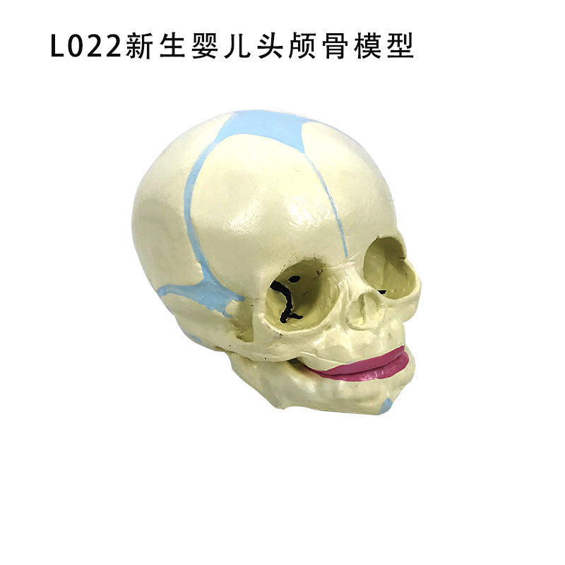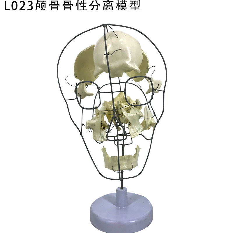 模型大小为20cm*14cm*17cm模型由22部件组成,由各部分颅骨串制于铁丝上,固定在底座上,以便于观察各骨之间的毗邻关系以及内外两侧、上下各面的结构特点及孔、管、沟、裂等,显示分解的22部件颅骨形态结构。