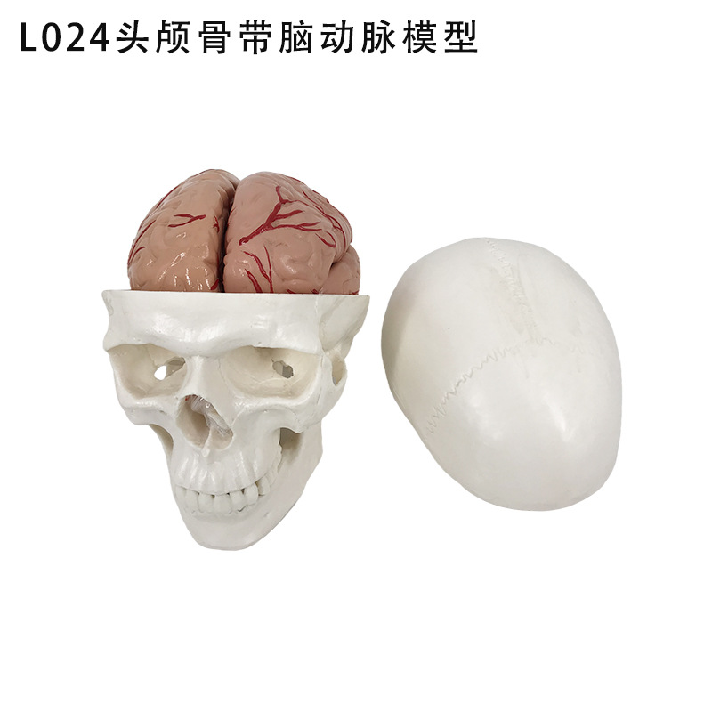 模型大小为20cm*14cm*17cm模型(颅脑模型)可拆分为11部件,由颅盖、颅底、下颌骨、前叶、顶叶、颞叶、枕叶、脑干、小脑等组成,模型上颌骨和下颌用弹簧连接起来,可以自由活动,颅盖可打开,可观察到颅骨内分解成8部分的脑模型,脑模型上标有脑动脉,该模型完整的展示了头颅骨与脑的相互毗邻关系及颅内外的结构形态和骨性标志。