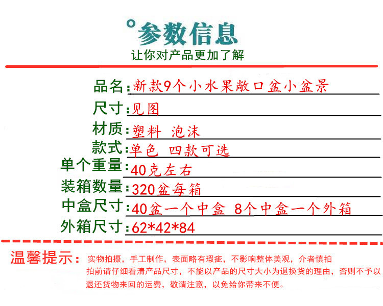 材质: 塑料 品种: 发财果 工艺: 注塑 高度: 14 是否专利货源: 否 颜色: 小桔子,小红果,小石榴,小辣椒 重量: 0.04 kg/盆