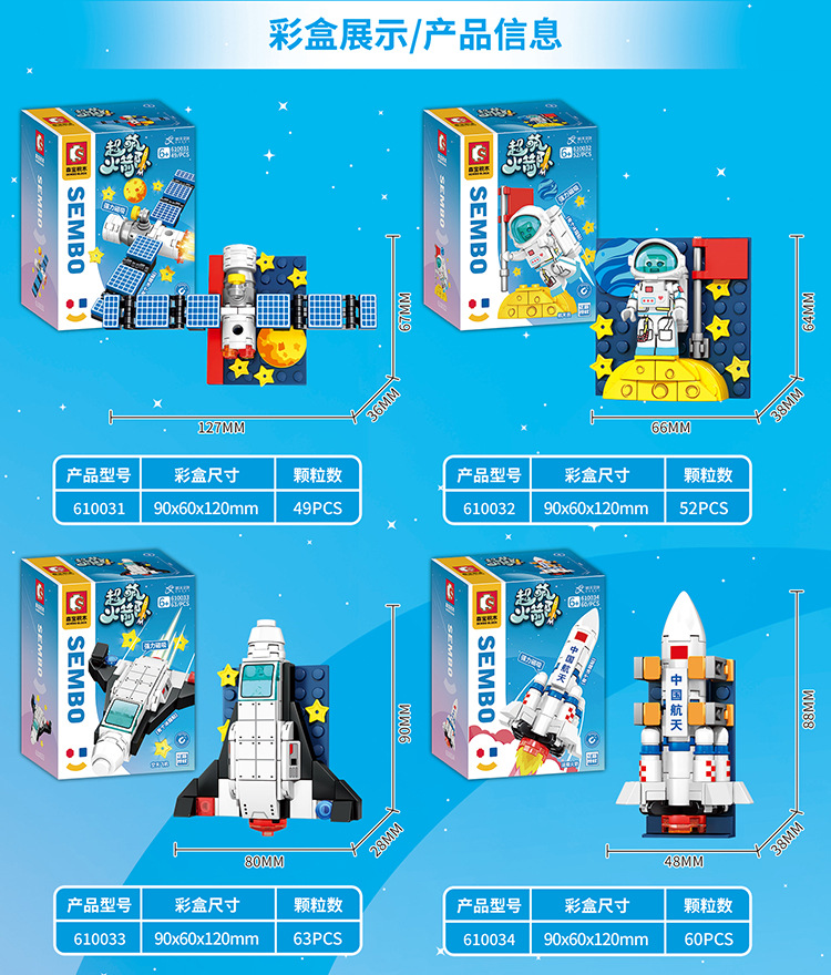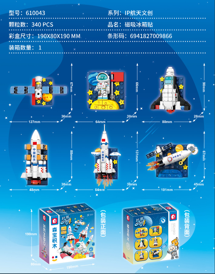 品牌: 森宝积木 材质: 塑料/塑胶 功能: 其他 塑料积木类型: 小颗粒 是否电动: 否 积木净重: 1.1kg 是否能够DIY: 是 3C配置类别: 14岁以下其它玩具 货号: 610031-36 产地: 中国 是否多功能: 是 包装方式: 彩盒 加工定制: 否 是否外贸: 否 塑料材质分类: ABS 是否专供外贸: 否 颜色: 航天冰箱贴(6款)【新老包装随机发】 适用年龄: 少年(7-14岁) 重量: 1.0 kg/个
