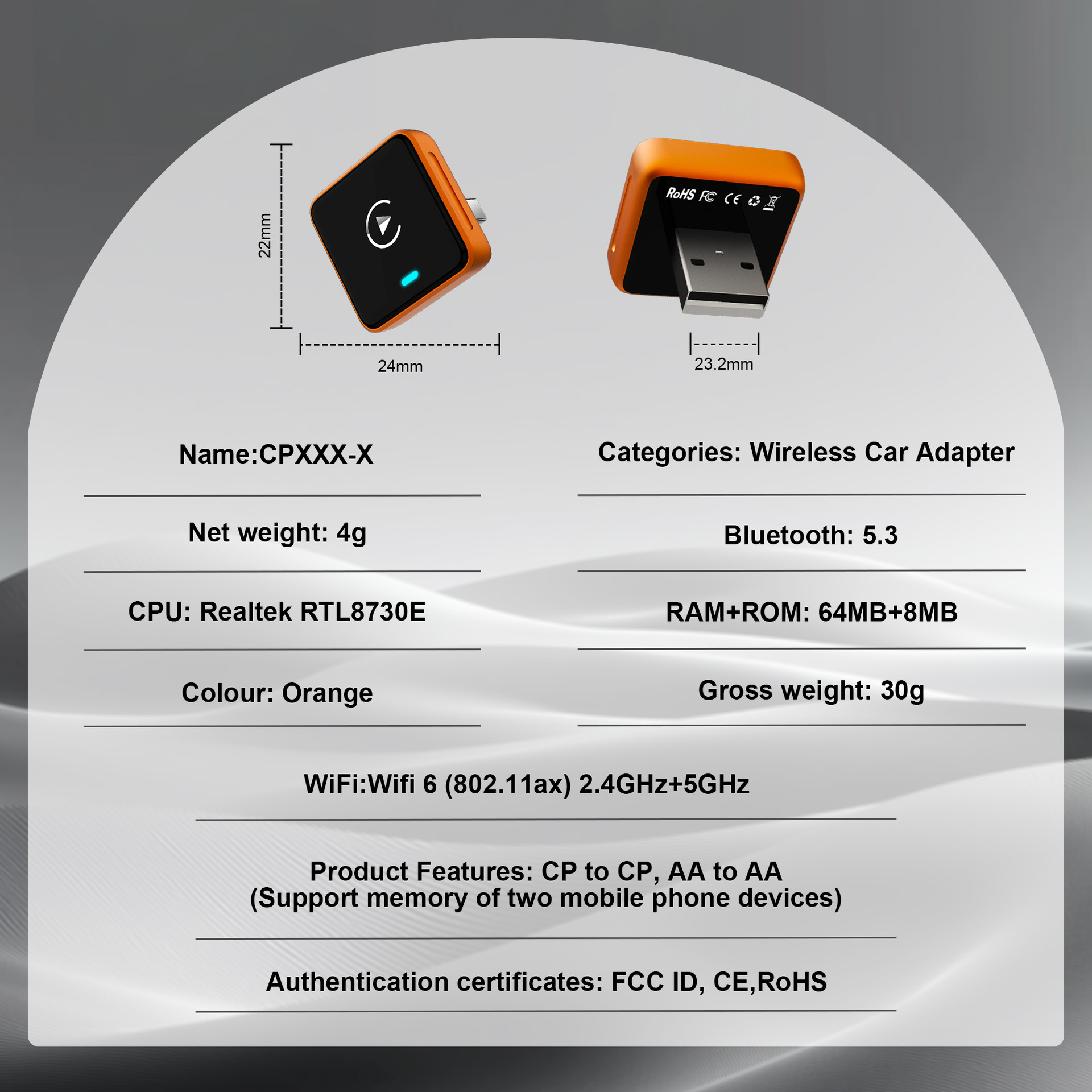 品牌: 其他 操作系统: CarPlay 适合车型: 原车自带有线CarPlay 屏幕尺寸: 无屏幕 型号: CP027-1 材质: 铝合金 运行内存: 8GB 分辨率: 1920x1080 产地: 深圳 加工定制: 是 CPU类型: 双核 机身内存: 16GB 重量: 10g 接口: 咨询客服 屏幕类型: 电容屏 外观尺寸: 24*22*23.2mm 货号: 【CP027-1】车载车机互联盒子 规格: CP027-1 橙色 颜色分类: 橙色 装箱数: 120 重量: 1.5 kg/个