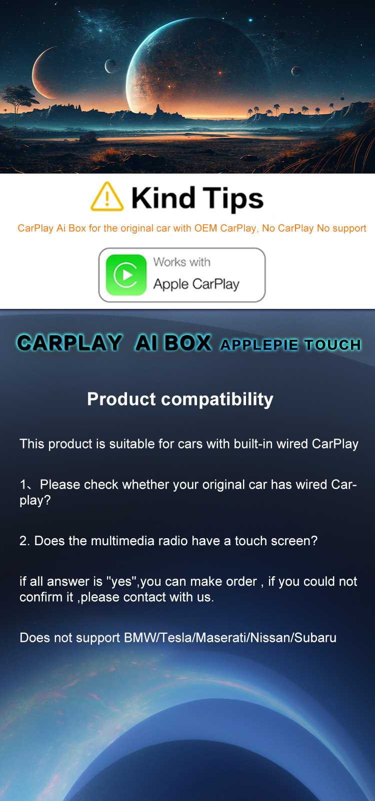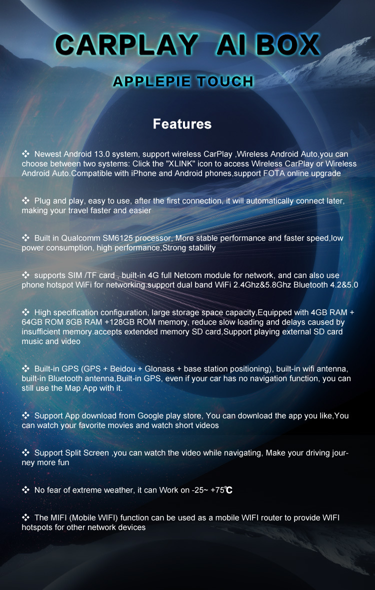 品牌: 其他 操作系统: CarPlay 适合车型: 原车自带有线CarPlay 屏幕尺寸: 7英寸 型号: AI025 材质: 铝合金 运行内存: 8GB 分辨率: 原车分辨率 产地: 深圳 加工定制: 是 CPU类型: 八核 重量: 50g 接口: 咨询客服 屏幕类型: 电容屏 外观尺寸: 咨询客服 显卡: 咨询客服 货号: 【 AI025】车载车机互联盒子 规格: AI025(高通6125带屏支无线/有线 主要下游平台: ebay,亚马逊,wish,速卖通,独立 装箱数: 120